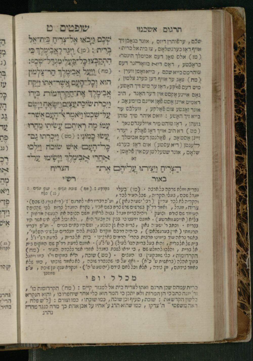Sefer Shofṭim / ʿim targum Ashkenazi, u-veʾur, meturgam u-mevoʾar me-et R. Meʾir Oborniḳ, ṿe-hosafti bo pe. ... Rashi z.ts.l., ṿe-gam be-khol maḳom she-neʿemar be-perusho milat b.l.ʿa.z., ba be-tsedo ... perusho b.l.A. Ṿe-nilṿeh elaṿ pe. Mikhlal yofi ... ...ספר שופטים / עם תרגום אשכנזי, ובאור, מתורגם ומבואר מאת ר׳ מאיר אברניק, והוספתי בו פי׳... רש״י זצ״ל, וגם בכל מקום שנאמר בפירושו מלת בלע״ז, בא בצידו ... פירושו בל״א. ונלוה אליו פי׳ מכלל יופי ... ...