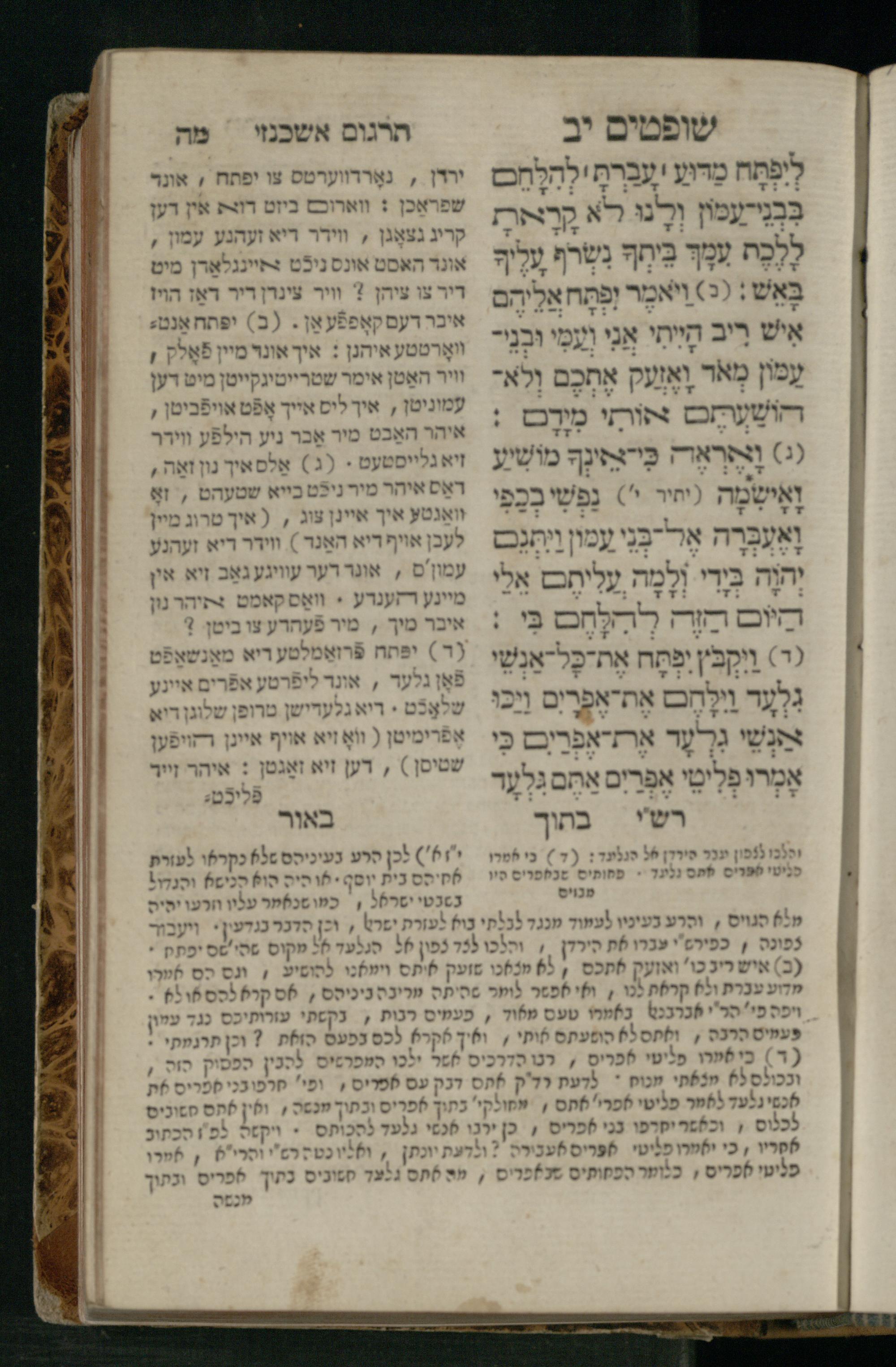 Sefer Shofṭim / ʿim targum Ashkenazi, u-veʾur, meturgam u-mevoʾar me-et R. Meʾir Oborniḳ, ṿe-hosafti bo pe. ... Rashi z.ts.l., ṿe-gam be-khol maḳom she-neʿemar be-perusho milat b.l.ʿa.z., ba be-tsedo ... perusho b.l.A. Ṿe-nilṿeh elaṿ pe. Mikhlal yofi ... ...ספר שופטים / עם תרגום אשכנזי, ובאור, מתורגם ומבואר מאת ר׳ מאיר אברניק, והוספתי בו פי׳... רש״י זצ״ל, וגם בכל מקום שנאמר בפירושו מלת בלע״ז, בא בצידו ... פירושו בל״א. ונלוה אליו פי׳ מכלל יופי ... ...