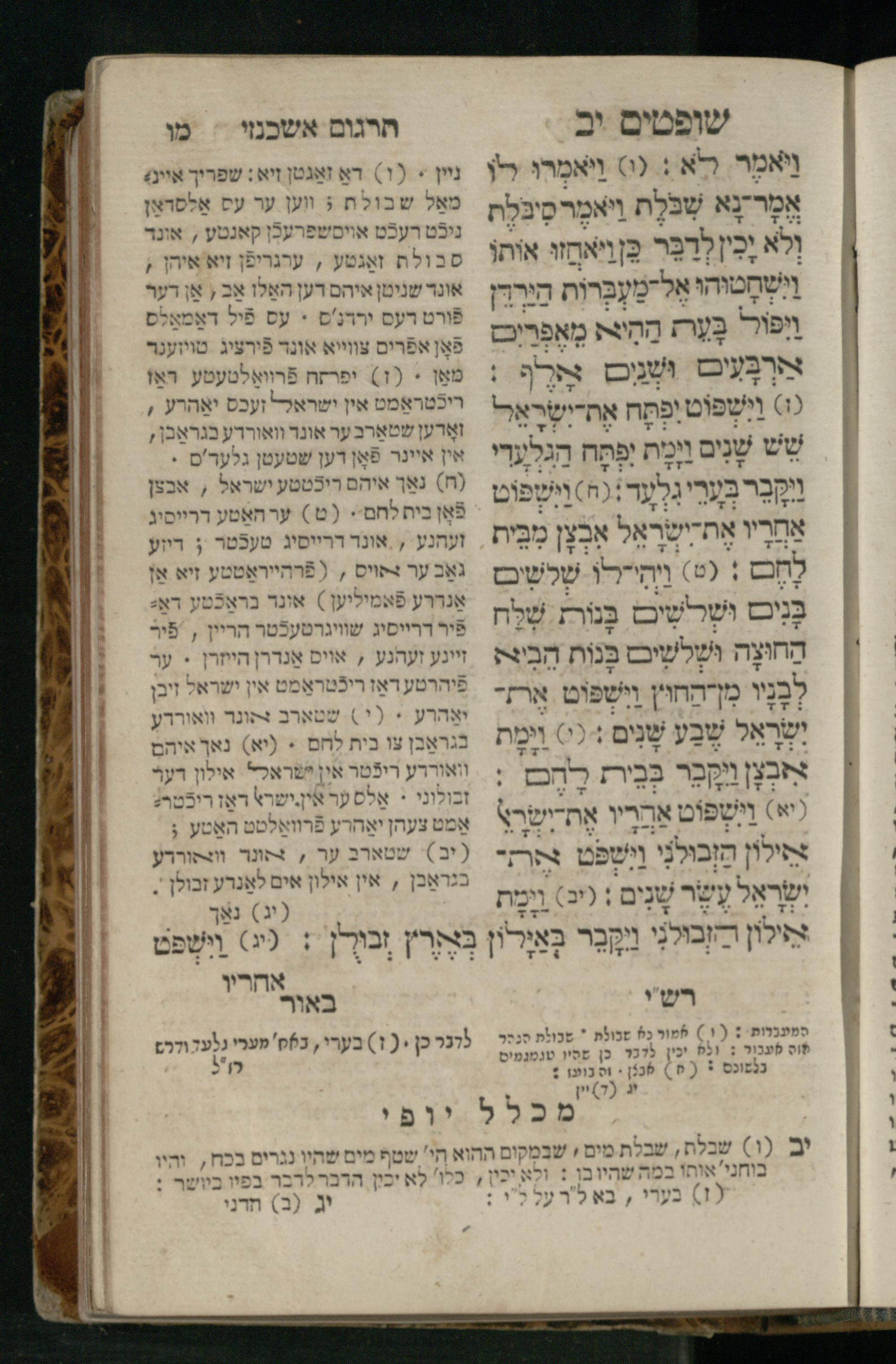 Sefer Shofṭim / ʿim targum Ashkenazi, u-veʾur, meturgam u-mevoʾar me-et R. Meʾir Oborniḳ, ṿe-hosafti bo pe. ... Rashi z.ts.l., ṿe-gam be-khol maḳom she-neʿemar be-perusho milat b.l.ʿa.z., ba be-tsedo ... perusho b.l.A. Ṿe-nilṿeh elaṿ pe. Mikhlal yofi ... ...ספר שופטים / עם תרגום אשכנזי, ובאור, מתורגם ומבואר מאת ר׳ מאיר אברניק, והוספתי בו פי׳... רש״י זצ״ל, וגם בכל מקום שנאמר בפירושו מלת בלע״ז, בא בצידו ... פירושו בל״א. ונלוה אליו פי׳ מכלל יופי ... ...