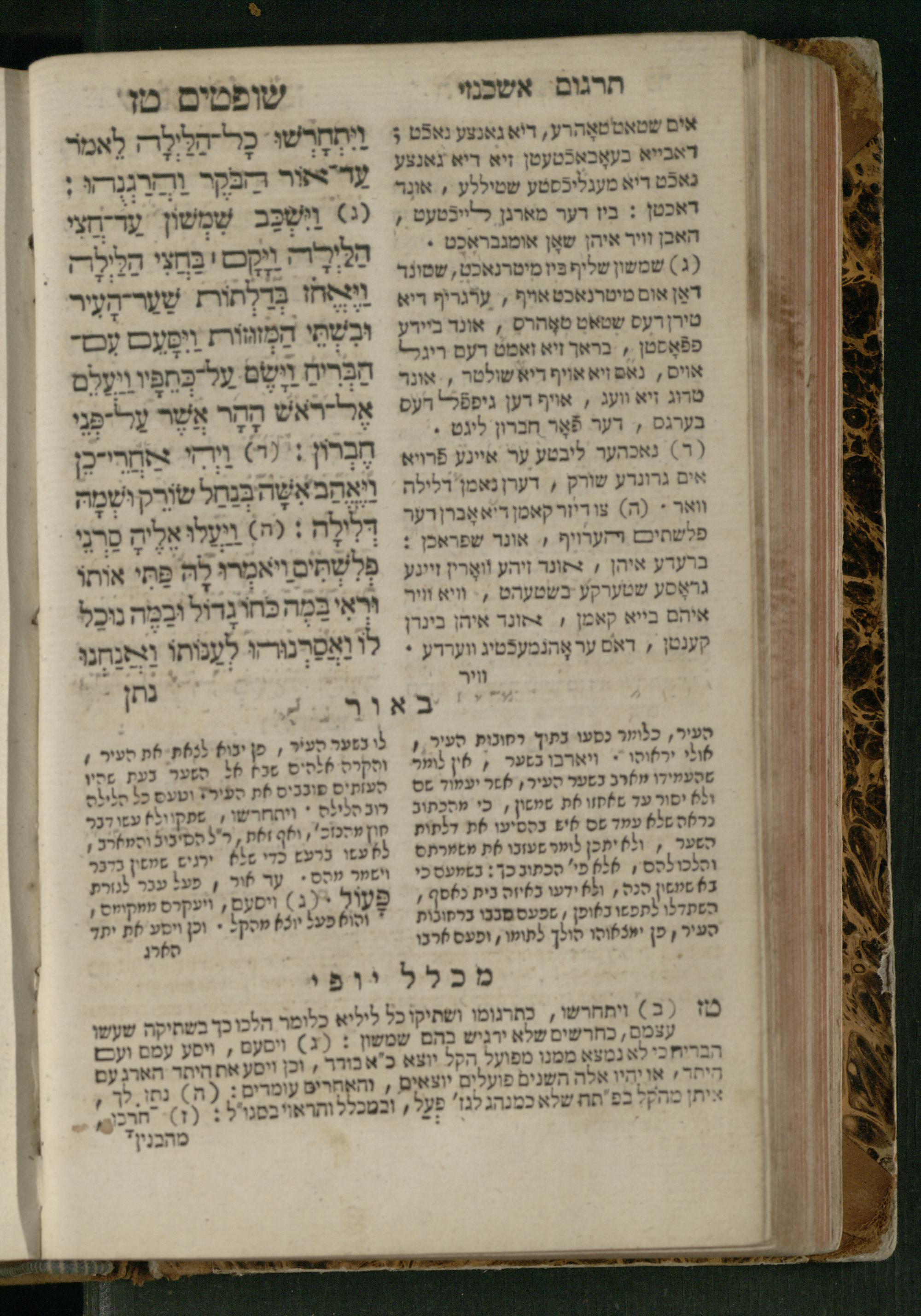 Sefer Shofṭim / ʿim targum Ashkenazi, u-veʾur, meturgam u-mevoʾar me-et R. Meʾir Oborniḳ, ṿe-hosafti bo pe. ... Rashi z.ts.l., ṿe-gam be-khol maḳom she-neʿemar be-perusho milat b.l.ʿa.z., ba be-tsedo ... perusho b.l.A. Ṿe-nilṿeh elaṿ pe. Mikhlal yofi ... ...ספר שופטים / עם תרגום אשכנזי, ובאור, מתורגם ומבואר מאת ר׳ מאיר אברניק, והוספתי בו פי׳... רש״י זצ״ל, וגם בכל מקום שנאמר בפירושו מלת בלע״ז, בא בצידו ... פירושו בל״א. ונלוה אליו פי׳ מכלל יופי ... ...