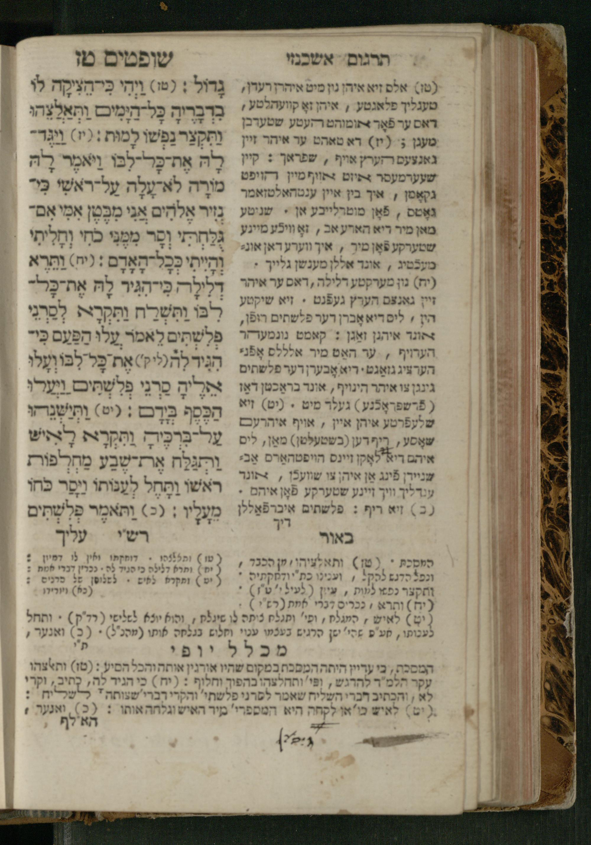 Sefer Shofṭim / ʿim targum Ashkenazi, u-veʾur, meturgam u-mevoʾar me-et R. Meʾir Oborniḳ, ṿe-hosafti bo pe. ... Rashi z.ts.l., ṿe-gam be-khol maḳom she-neʿemar be-perusho milat b.l.ʿa.z., ba be-tsedo ... perusho b.l.A. Ṿe-nilṿeh elaṿ pe. Mikhlal yofi ... ...ספר שופטים / עם תרגום אשכנזי, ובאור, מתורגם ומבואר מאת ר׳ מאיר אברניק, והוספתי בו פי׳... רש״י זצ״ל, וגם בכל מקום שנאמר בפירושו מלת בלע״ז, בא בצידו ... פירושו בל״א. ונלוה אליו פי׳ מכלל יופי ... ...
