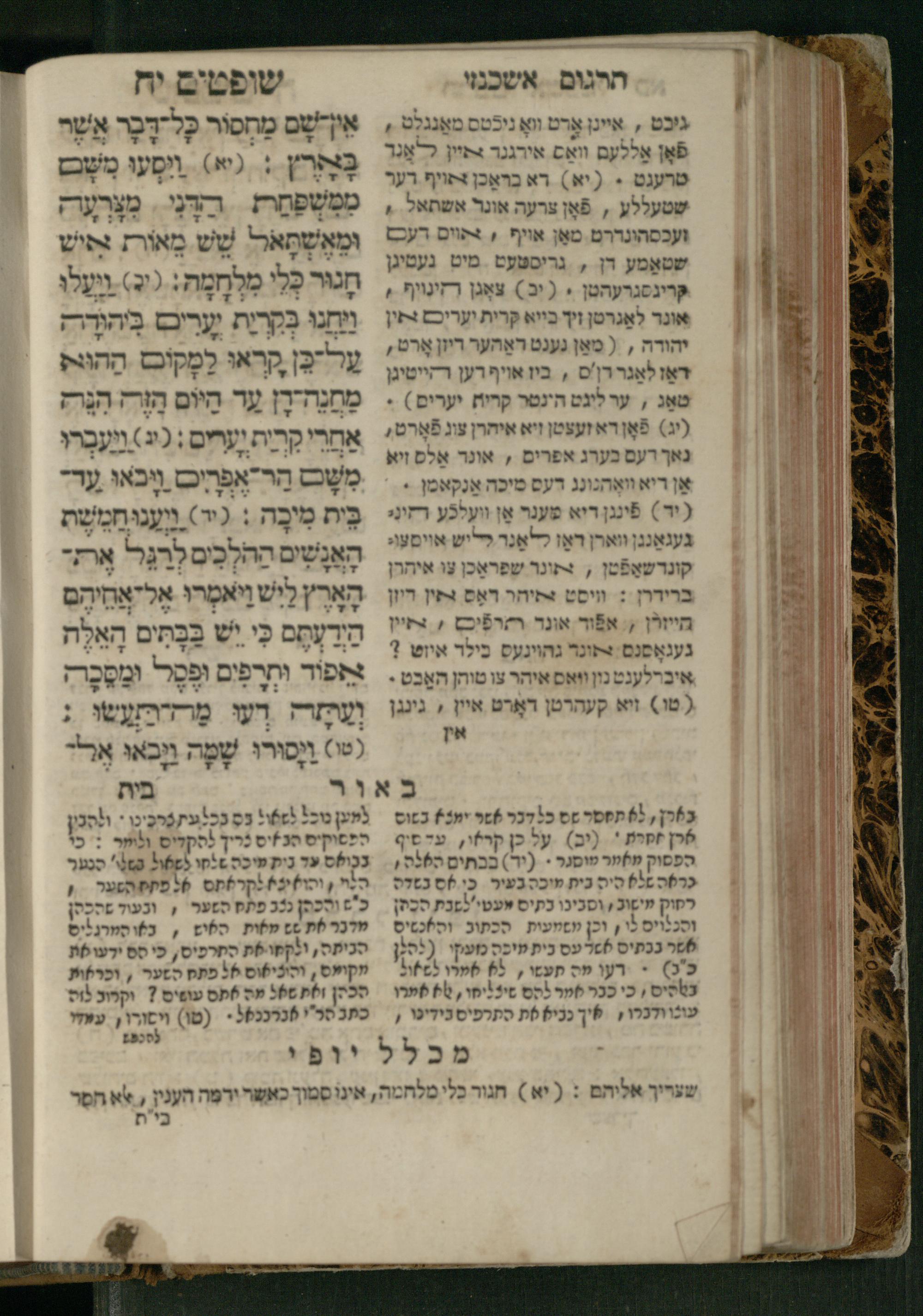 Sefer Shofṭim / ʿim targum Ashkenazi, u-veʾur, meturgam u-mevoʾar me-et R. Meʾir Oborniḳ, ṿe-hosafti bo pe. ... Rashi z.ts.l., ṿe-gam be-khol maḳom she-neʿemar be-perusho milat b.l.ʿa.z., ba be-tsedo ... perusho b.l.A. Ṿe-nilṿeh elaṿ pe. Mikhlal yofi ... ...ספר שופטים / עם תרגום אשכנזי, ובאור, מתורגם ומבואר מאת ר׳ מאיר אברניק, והוספתי בו פי׳... רש״י זצ״ל, וגם בכל מקום שנאמר בפירושו מלת בלע״ז, בא בצידו ... פירושו בל״א. ונלוה אליו פי׳ מכלל יופי ... ...