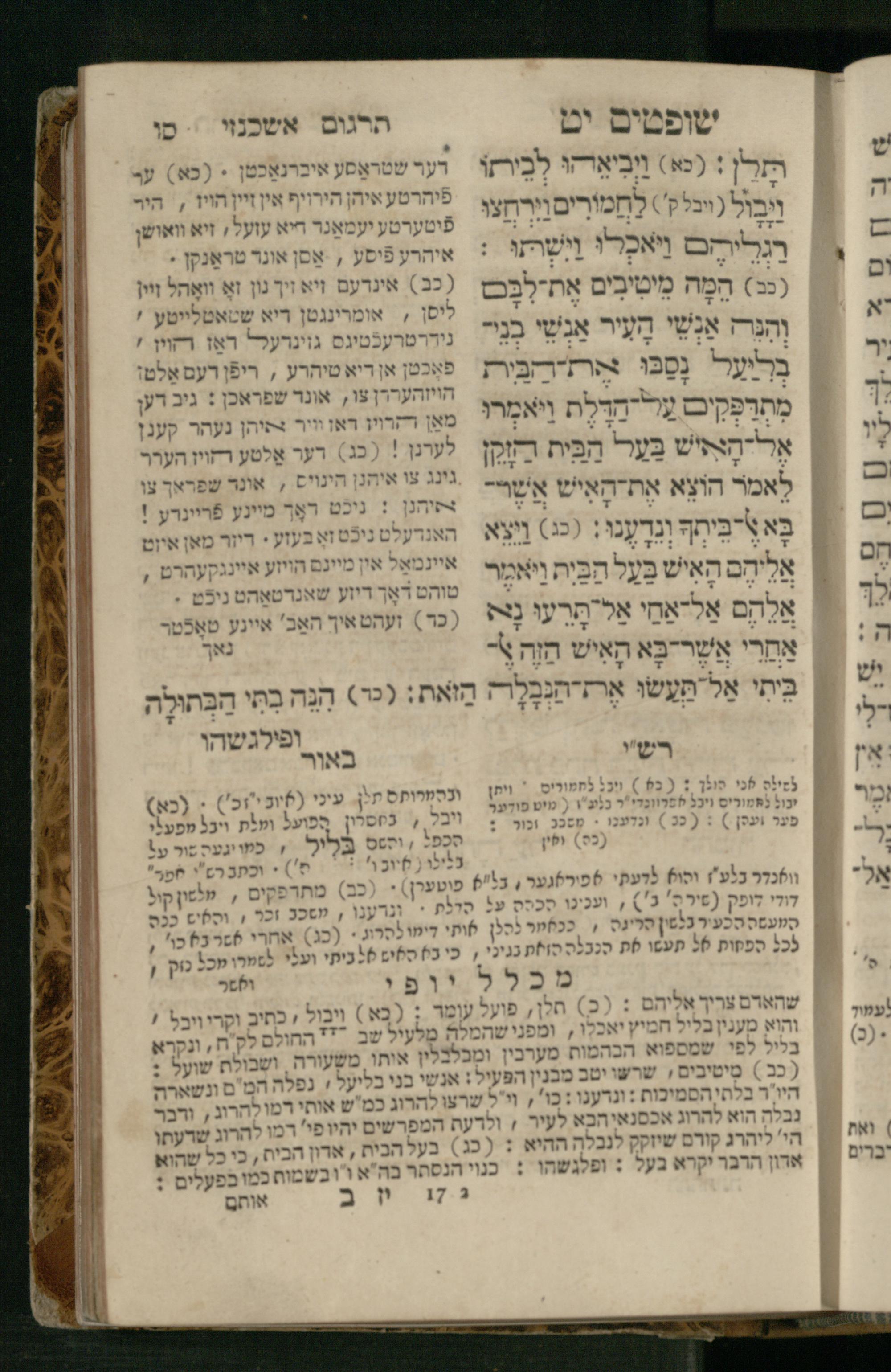 Sefer Shofṭim / ʿim targum Ashkenazi, u-veʾur, meturgam u-mevoʾar me-et R. Meʾir Oborniḳ, ṿe-hosafti bo pe. ... Rashi z.ts.l., ṿe-gam be-khol maḳom she-neʿemar be-perusho milat b.l.ʿa.z., ba be-tsedo ... perusho b.l.A. Ṿe-nilṿeh elaṿ pe. Mikhlal yofi ... ...ספר שופטים / עם תרגום אשכנזי, ובאור, מתורגם ומבואר מאת ר׳ מאיר אברניק, והוספתי בו פי׳... רש״י זצ״ל, וגם בכל מקום שנאמר בפירושו מלת בלע״ז, בא בצידו ... פירושו בל״א. ונלוה אליו פי׳ מכלל יופי ... ...