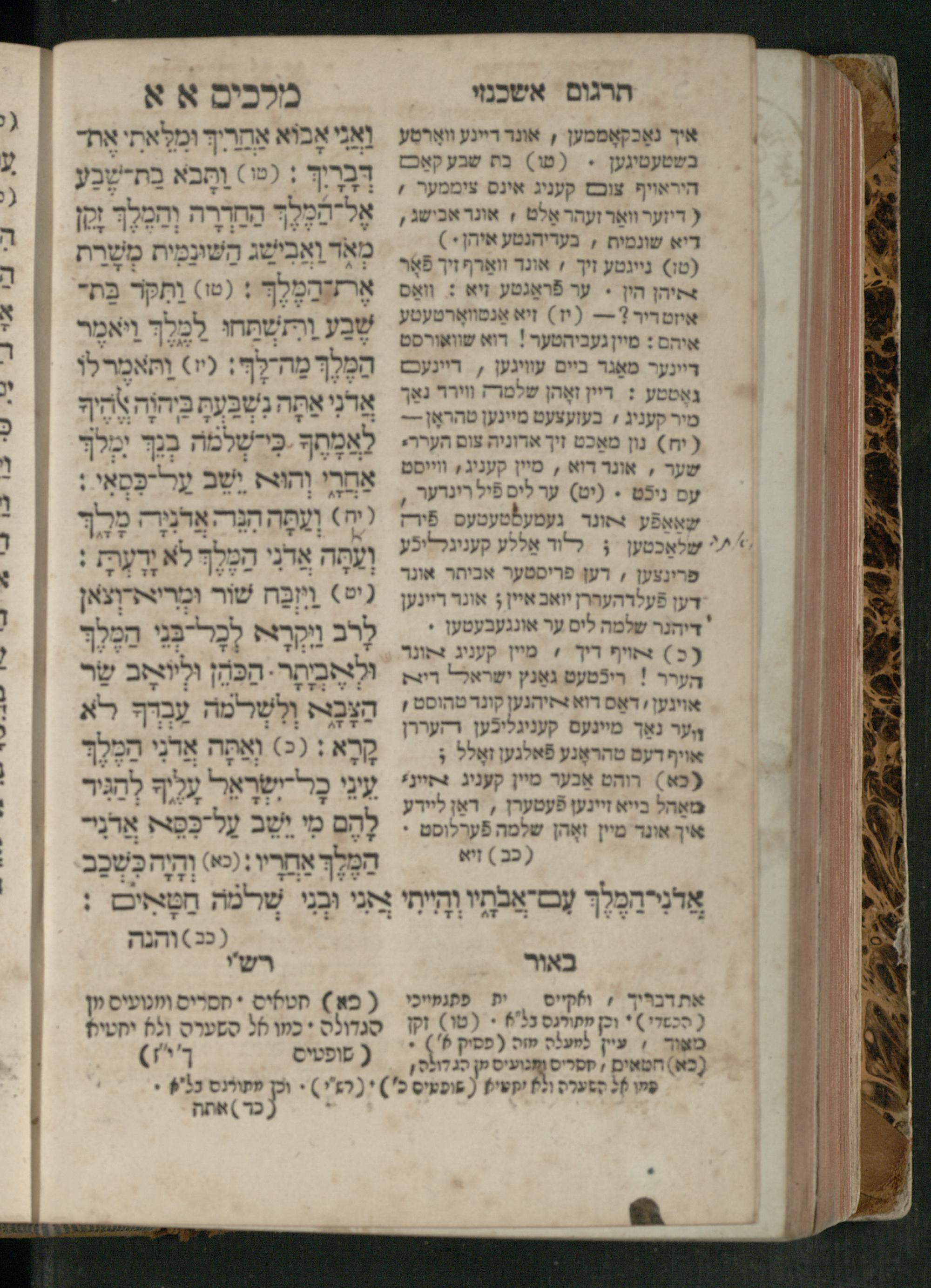Sefer Melakhim 1 / ʿim targum Ashkenazi u-veʾur [meturgam u-mevoʾar ʿal-yede R. Meʾir Oborniḳ], ṿe-hosafti bo pe. ... Rashi z.ts.l. ... Ṿe-nilṿeh elaṿ pe. Mikhlal yofi ...ספר מלכים א / עם תרגום אשכנזי ובאור [מתורגם ומבואר על ידי ר׳ מאיר אברניק], והוספתי בו פי׳... רש״י זצ״ל. ... ונלוה אליו פי׳ מכלל יופי ...