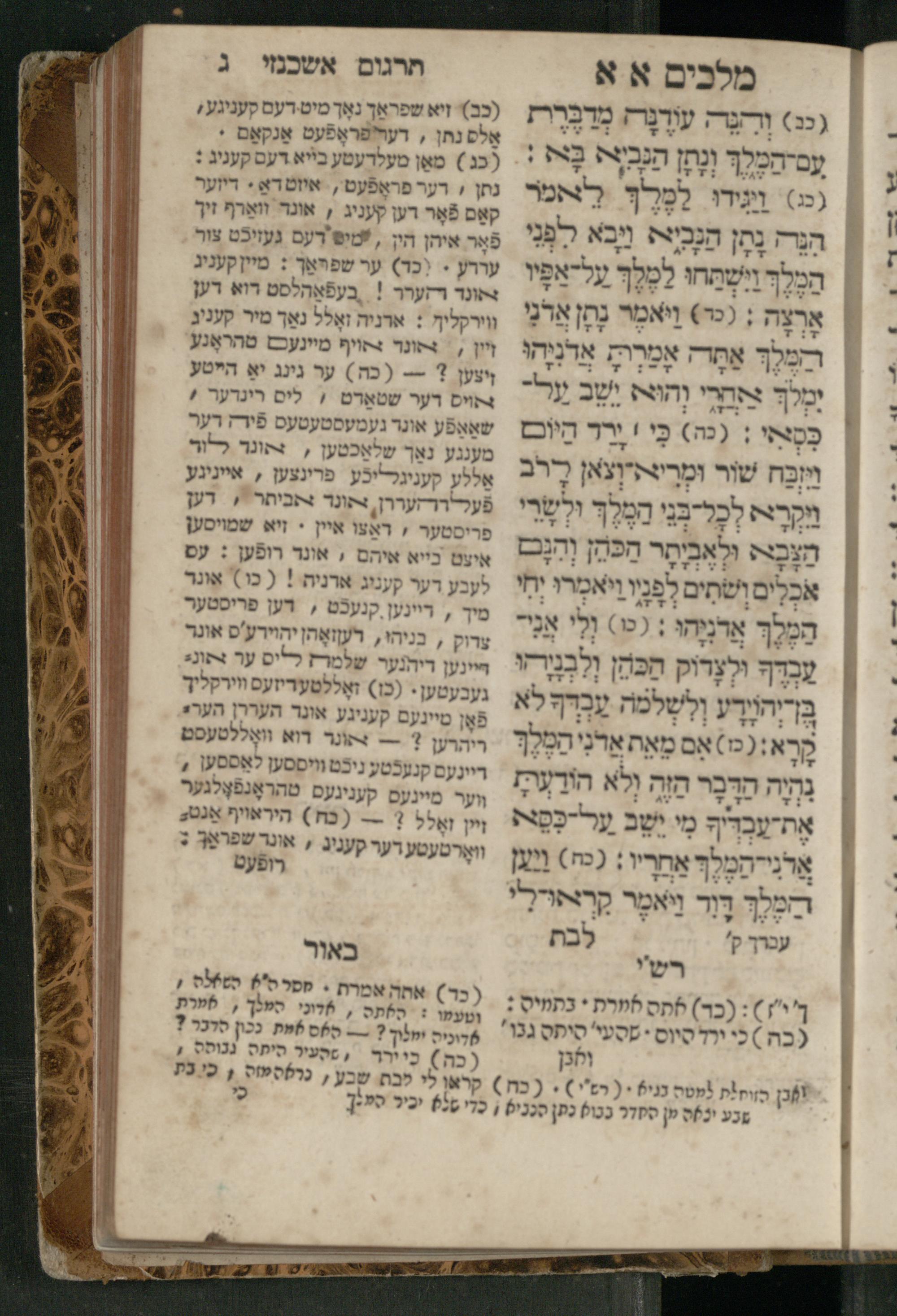 Sefer Melakhim 1 / ʿim targum Ashkenazi u-veʾur [meturgam u-mevoʾar ʿal-yede R. Meʾir Oborniḳ], ṿe-hosafti bo pe. ... Rashi z.ts.l. ... Ṿe-nilṿeh elaṿ pe. Mikhlal yofi ...ספר מלכים א / עם תרגום אשכנזי ובאור [מתורגם ומבואר על ידי ר׳ מאיר אברניק], והוספתי בו פי׳... רש״י זצ״ל. ... ונלוה אליו פי׳ מכלל יופי ...