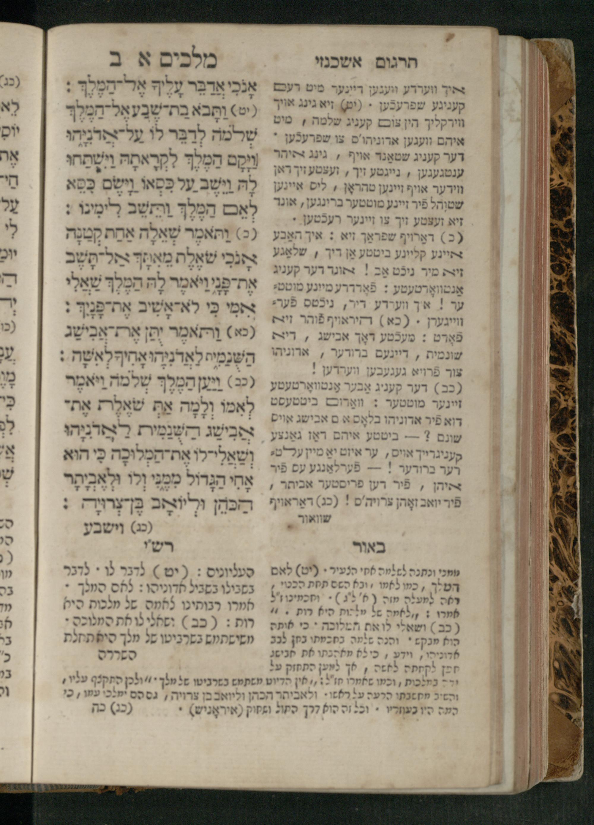 Sefer Melakhim 1 / ʿim targum Ashkenazi u-veʾur [meturgam u-mevoʾar ʿal-yede R. Meʾir Oborniḳ], ṿe-hosafti bo pe. ... Rashi z.ts.l. ... Ṿe-nilṿeh elaṿ pe. Mikhlal yofi ...ספר מלכים א / עם תרגום אשכנזי ובאור [מתורגם ומבואר על ידי ר׳ מאיר אברניק], והוספתי בו פי׳... רש״י זצ״ל. ... ונלוה אליו פי׳ מכלל יופי ...
