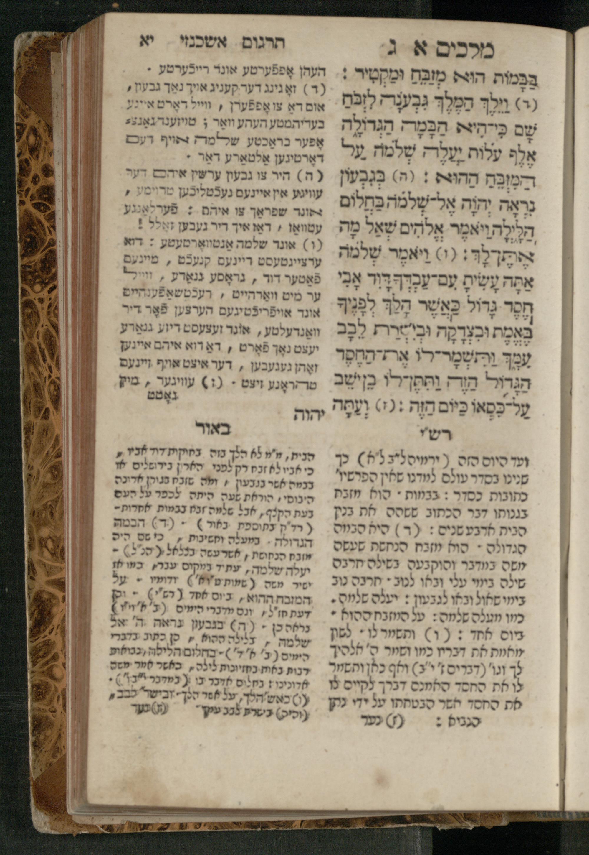 Sefer Melakhim 1 / ʿim targum Ashkenazi u-veʾur [meturgam u-mevoʾar ʿal-yede R. Meʾir Oborniḳ], ṿe-hosafti bo pe. ... Rashi z.ts.l. ... Ṿe-nilṿeh elaṿ pe. Mikhlal yofi ...ספר מלכים א / עם תרגום אשכנזי ובאור [מתורגם ומבואר על ידי ר׳ מאיר אברניק], והוספתי בו פי׳... רש״י זצ״ל. ... ונלוה אליו פי׳ מכלל יופי ...