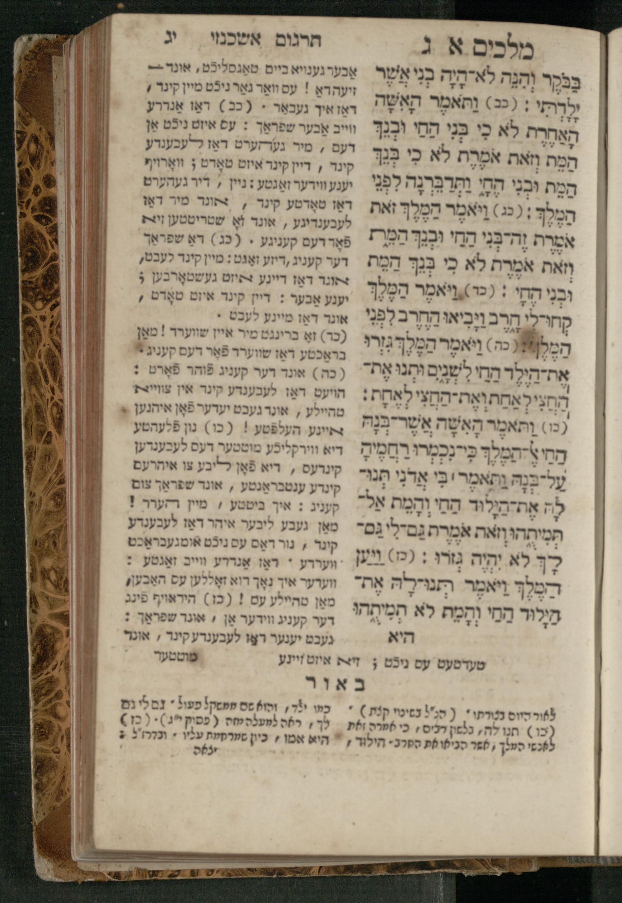 Sefer Melakhim 1 / ʿim targum Ashkenazi u-veʾur [meturgam u-mevoʾar ʿal-yede R. Meʾir Oborniḳ], ṿe-hosafti bo pe. ... Rashi z.ts.l. ... Ṿe-nilṿeh elaṿ pe. Mikhlal yofi ...ספר מלכים א / עם תרגום אשכנזי ובאור [מתורגם ומבואר על ידי ר׳ מאיר אברניק], והוספתי בו פי׳... רש״י זצ״ל. ... ונלוה אליו פי׳ מכלל יופי ...