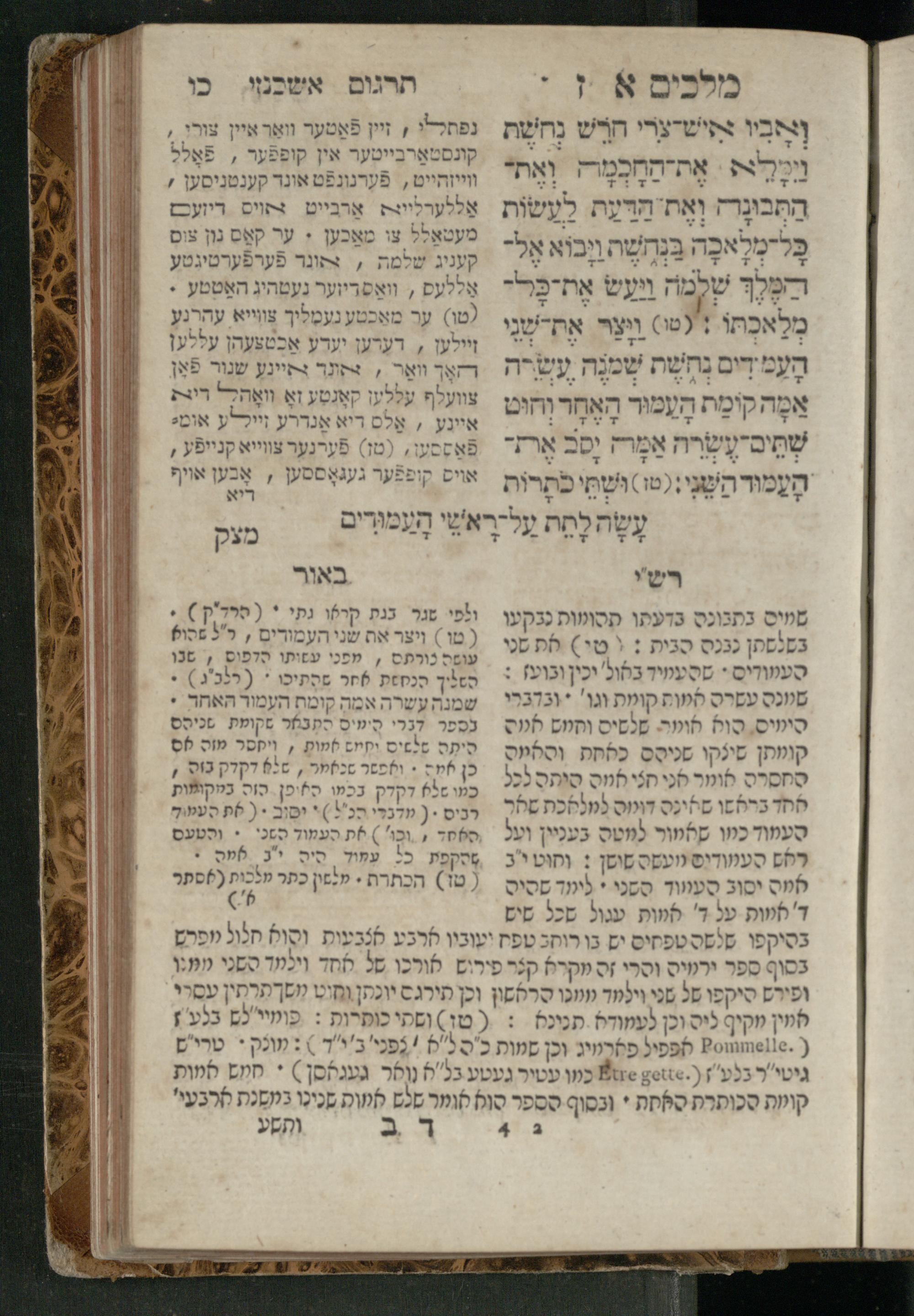 Sefer Melakhim 1 / ʿim targum Ashkenazi u-veʾur [meturgam u-mevoʾar ʿal-yede R. Meʾir Oborniḳ], ṿe-hosafti bo pe. ... Rashi z.ts.l. ... Ṿe-nilṿeh elaṿ pe. Mikhlal yofi ...ספר מלכים א / עם תרגום אשכנזי ובאור [מתורגם ומבואר על ידי ר׳ מאיר אברניק], והוספתי בו פי׳... רש״י זצ״ל. ... ונלוה אליו פי׳ מכלל יופי ...