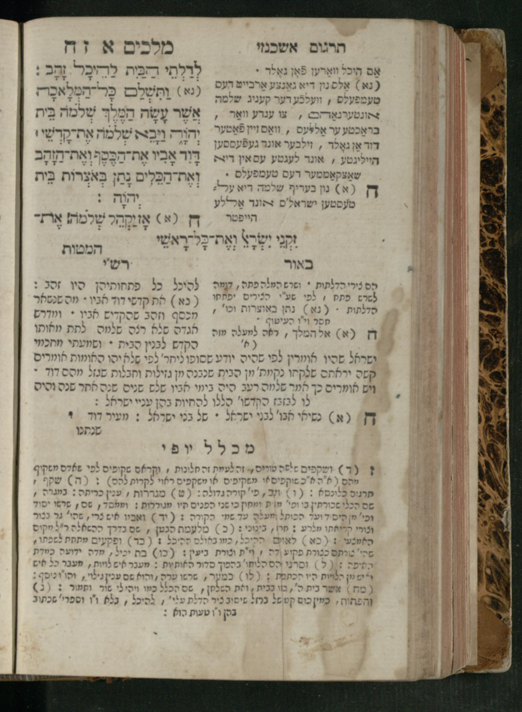Sefer Melakhim 1 / ʿim targum Ashkenazi u-veʾur [meturgam u-mevoʾar ʿal-yede R. Meʾir Oborniḳ], ṿe-hosafti bo pe. ... Rashi z.ts.l. ... Ṿe-nilṿeh elaṿ pe. Mikhlal yofi ...ספר מלכים א / עם תרגום אשכנזי ובאור [מתורגם ומבואר על ידי ר׳ מאיר אברניק], והוספתי בו פי׳... רש״י זצ״ל. ... ונלוה אליו פי׳ מכלל יופי ...