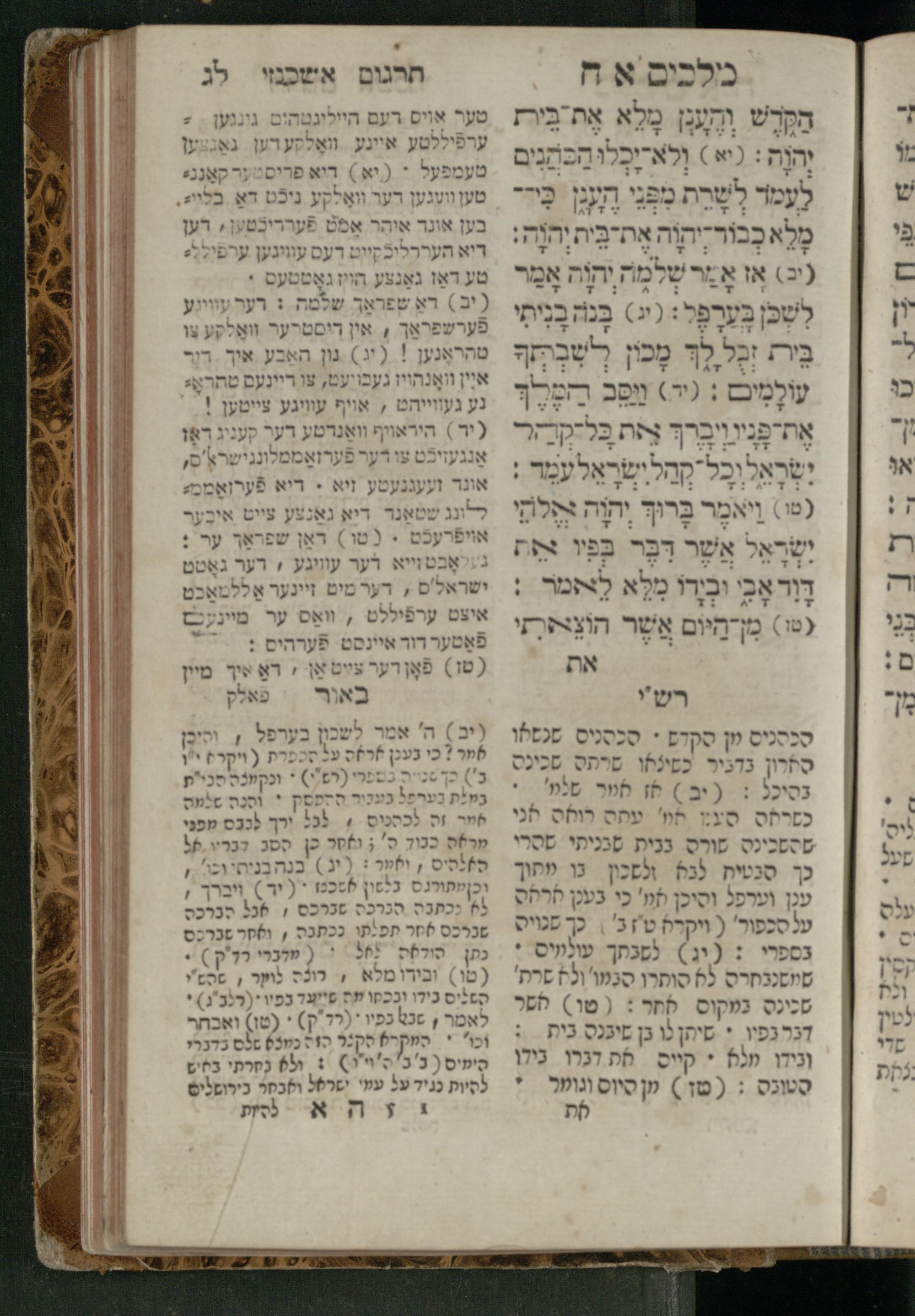 Sefer Melakhim 1 / ʿim targum Ashkenazi u-veʾur [meturgam u-mevoʾar ʿal-yede R. Meʾir Oborniḳ], ṿe-hosafti bo pe. ... Rashi z.ts.l. ... Ṿe-nilṿeh elaṿ pe. Mikhlal yofi ...ספר מלכים א / עם תרגום אשכנזי ובאור [מתורגם ומבואר על ידי ר׳ מאיר אברניק], והוספתי בו פי׳... רש״י זצ״ל. ... ונלוה אליו פי׳ מכלל יופי ...