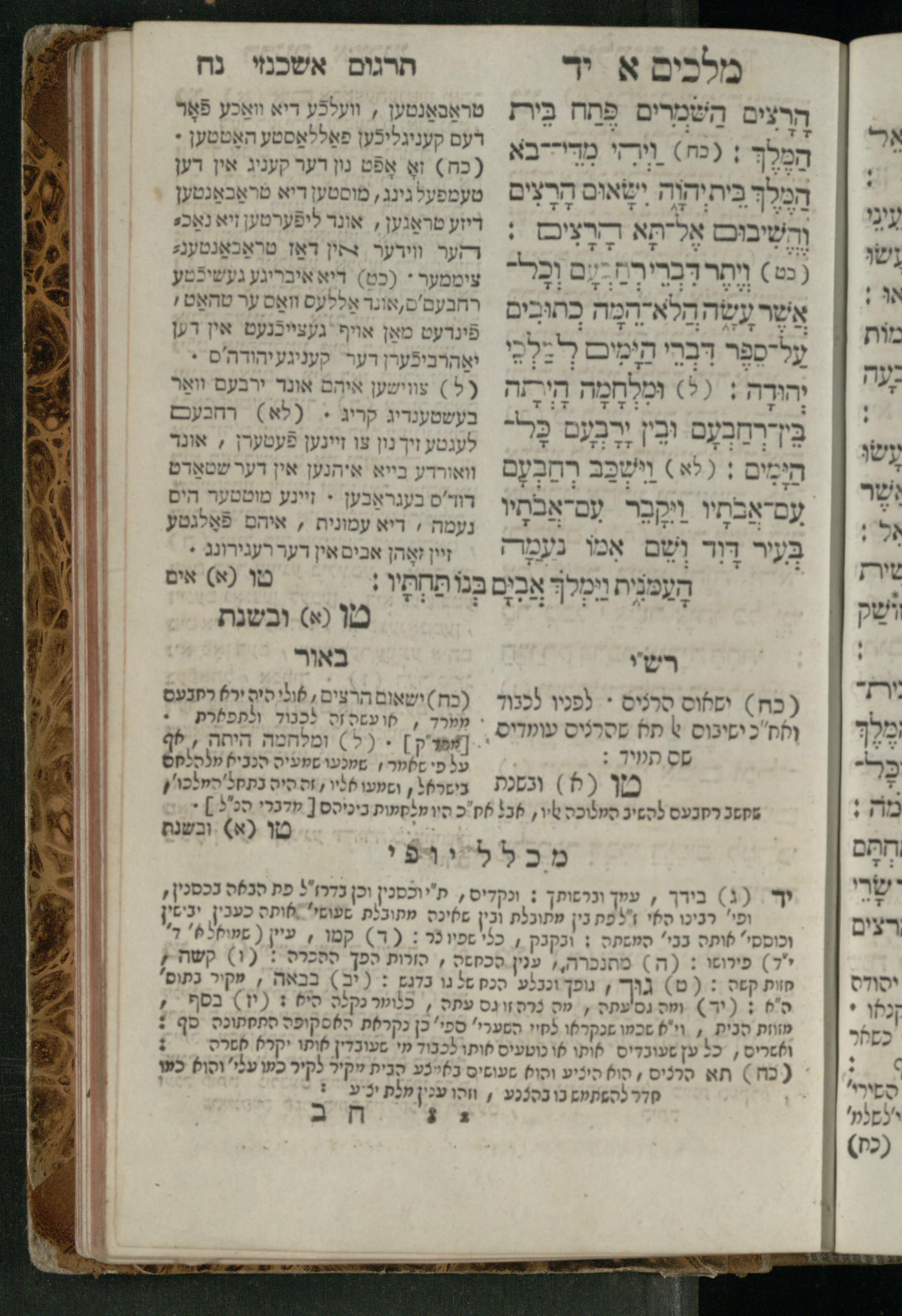 Sefer Melakhim 1 / ʿim targum Ashkenazi u-veʾur [meturgam u-mevoʾar ʿal-yede R. Meʾir Oborniḳ], ṿe-hosafti bo pe. ... Rashi z.ts.l. ... Ṿe-nilṿeh elaṿ pe. Mikhlal yofi ...ספר מלכים א / עם תרגום אשכנזי ובאור [מתורגם ומבואר על ידי ר׳ מאיר אברניק], והוספתי בו פי׳... רש״י זצ״ל. ... ונלוה אליו פי׳ מכלל יופי ...
