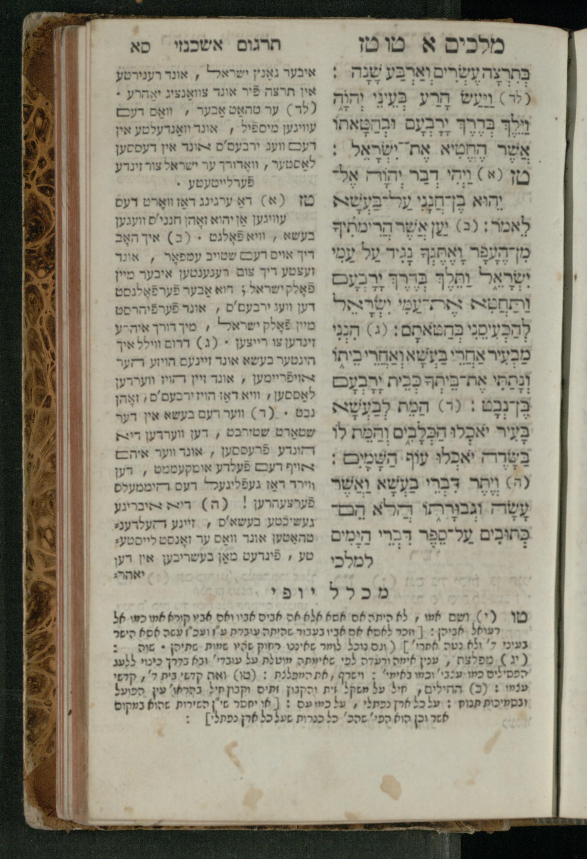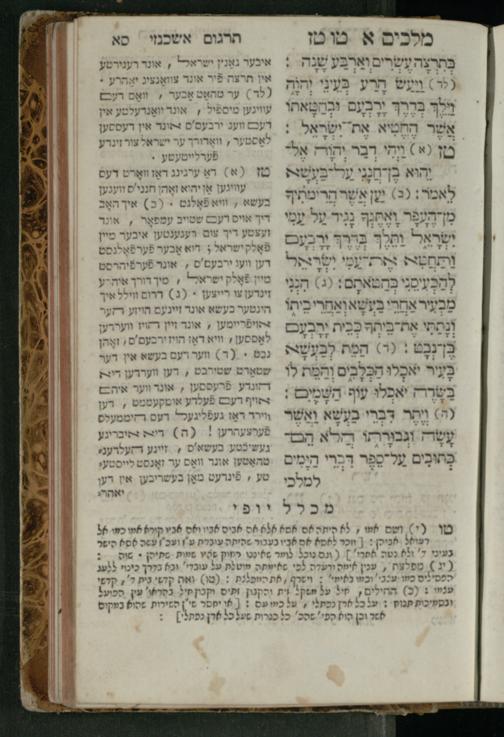 Sefer Melakhim 1 / ʿim targum Ashkenazi u-veʾur [meturgam u-mevoʾar ʿal-yede R. Meʾir Oborniḳ], ṿe-hosafti bo pe. ... Rashi z.ts.l. ... Ṿe-nilṿeh elaṿ pe. Mikhlal yofi ...ספר מלכים א / עם תרגום אשכנזי ובאור [מתורגם ומבואר על ידי ר׳ מאיר אברניק], והוספתי בו פי׳... רש״י זצ״ל. ... ונלוה אליו פי׳ מכלל יופי ...
