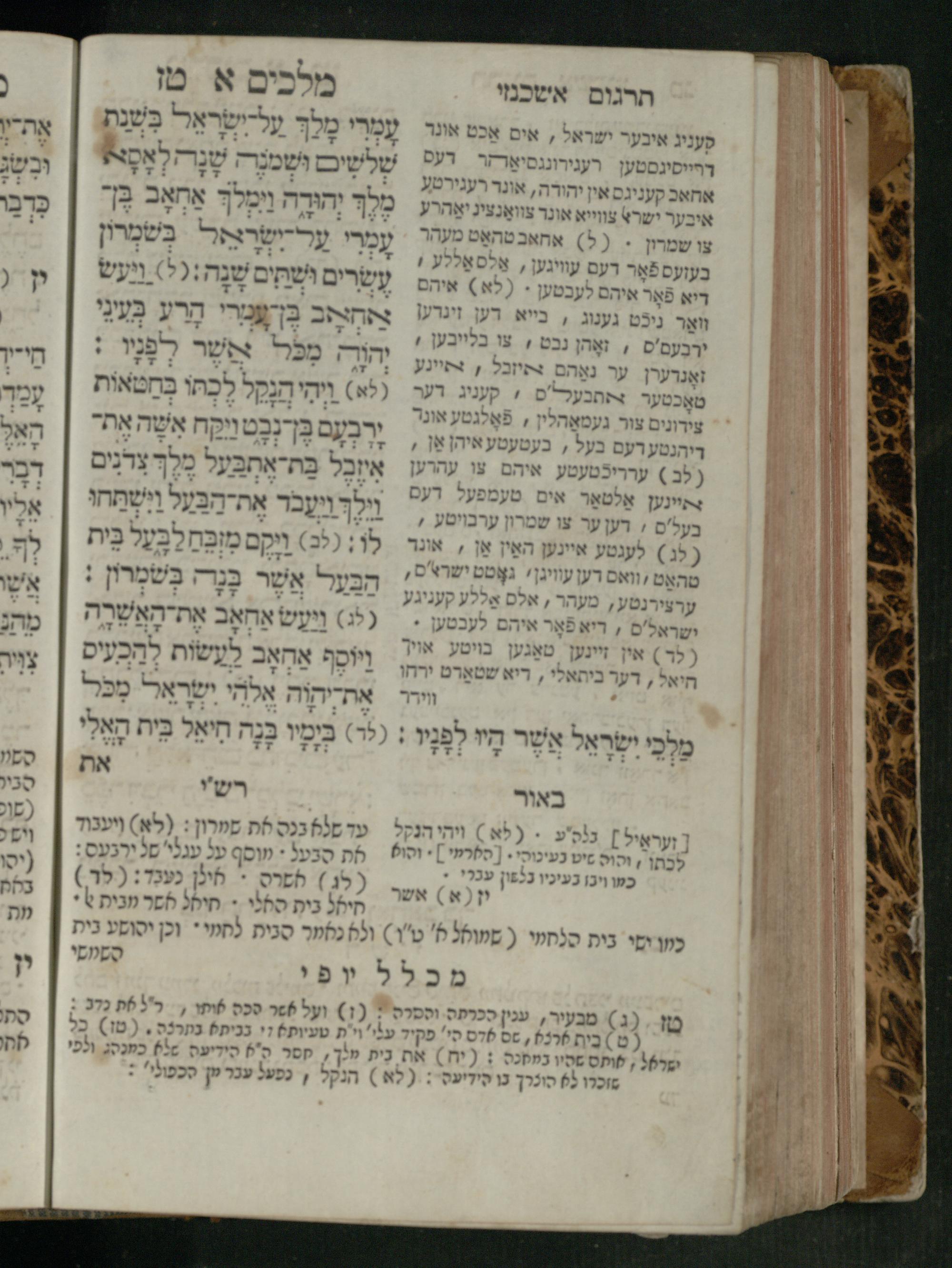 Sefer Melakhim 1 / ʿim targum Ashkenazi u-veʾur [meturgam u-mevoʾar ʿal-yede R. Meʾir Oborniḳ], ṿe-hosafti bo pe. ... Rashi z.ts.l. ... Ṿe-nilṿeh elaṿ pe. Mikhlal yofi ...ספר מלכים א / עם תרגום אשכנזי ובאור [מתורגם ומבואר על ידי ר׳ מאיר אברניק], והוספתי בו פי׳... רש״י זצ״ל. ... ונלוה אליו פי׳ מכלל יופי ...