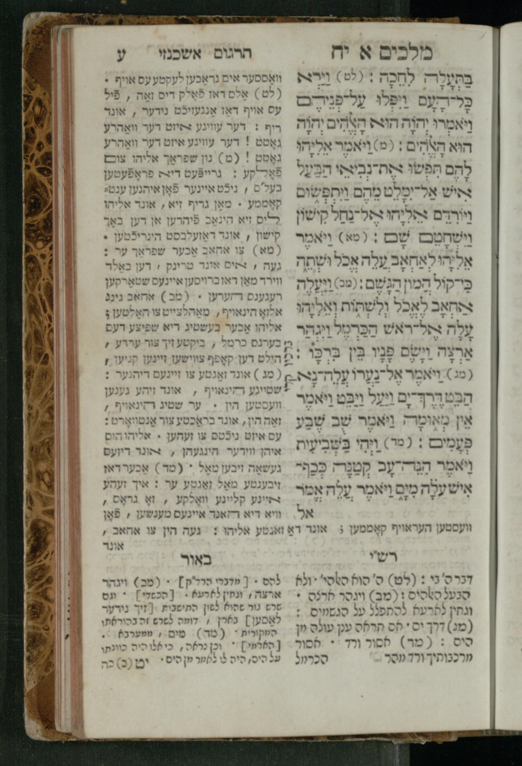 Sefer Melakhim 1 / ʿim targum Ashkenazi u-veʾur [meturgam u-mevoʾar ʿal-yede R. Meʾir Oborniḳ], ṿe-hosafti bo pe. ... Rashi z.ts.l. ... Ṿe-nilṿeh elaṿ pe. Mikhlal yofi ...ספר מלכים א / עם תרגום אשכנזי ובאור [מתורגם ומבואר על ידי ר׳ מאיר אברניק], והוספתי בו פי׳... רש״י זצ״ל. ... ונלוה אליו פי׳ מכלל יופי ...