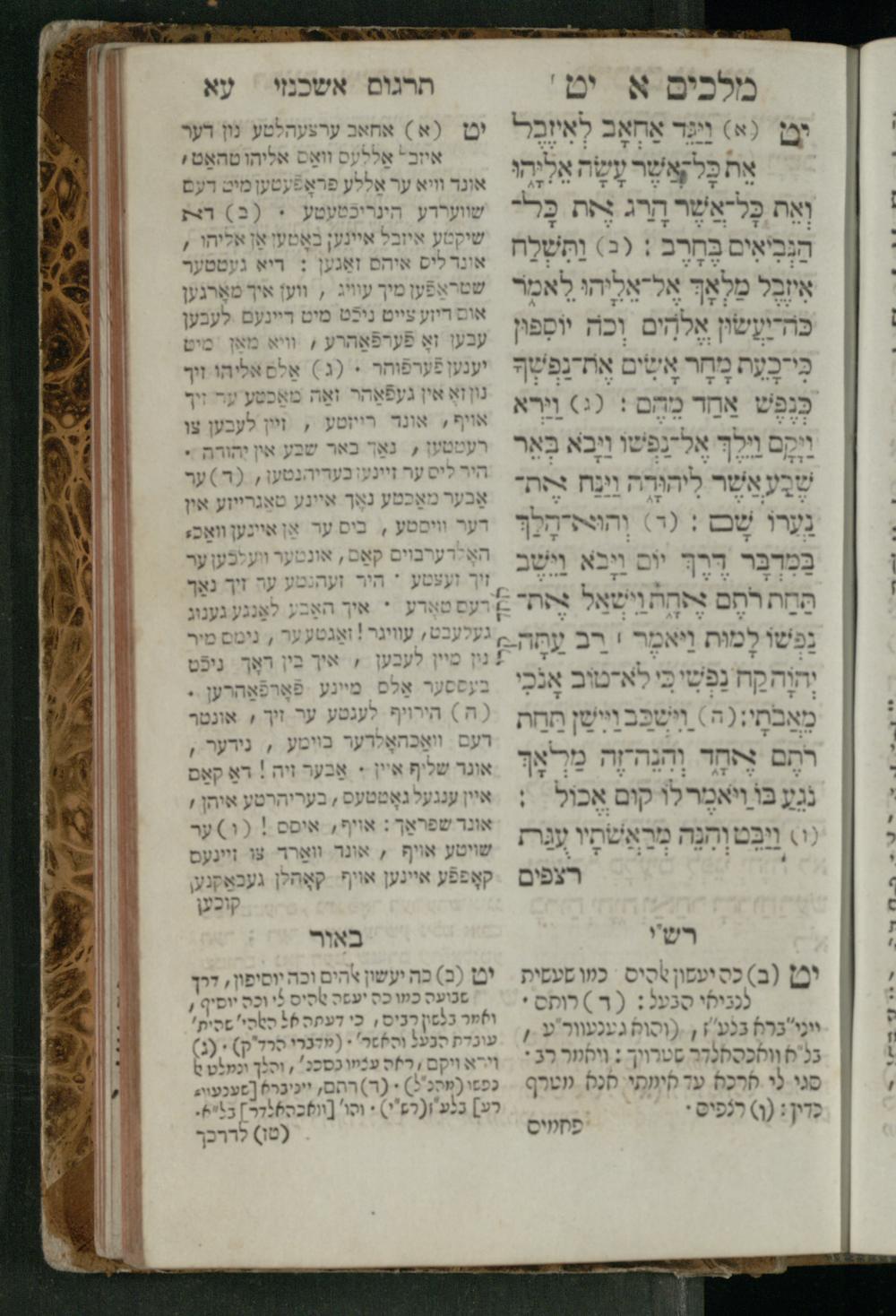 Sefer Melakhim 1 / ʿim targum Ashkenazi u-veʾur [meturgam u-mevoʾar ʿal-yede R. Meʾir Oborniḳ], ṿe-hosafti bo pe. ... Rashi z.ts.l. ... Ṿe-nilṿeh elaṿ pe. Mikhlal yofi ...ספר מלכים א / עם תרגום אשכנזי ובאור [מתורגם ומבואר על ידי ר׳ מאיר אברניק], והוספתי בו פי׳... רש״י זצ״ל. ... ונלוה אליו פי׳ מכלל יופי ...