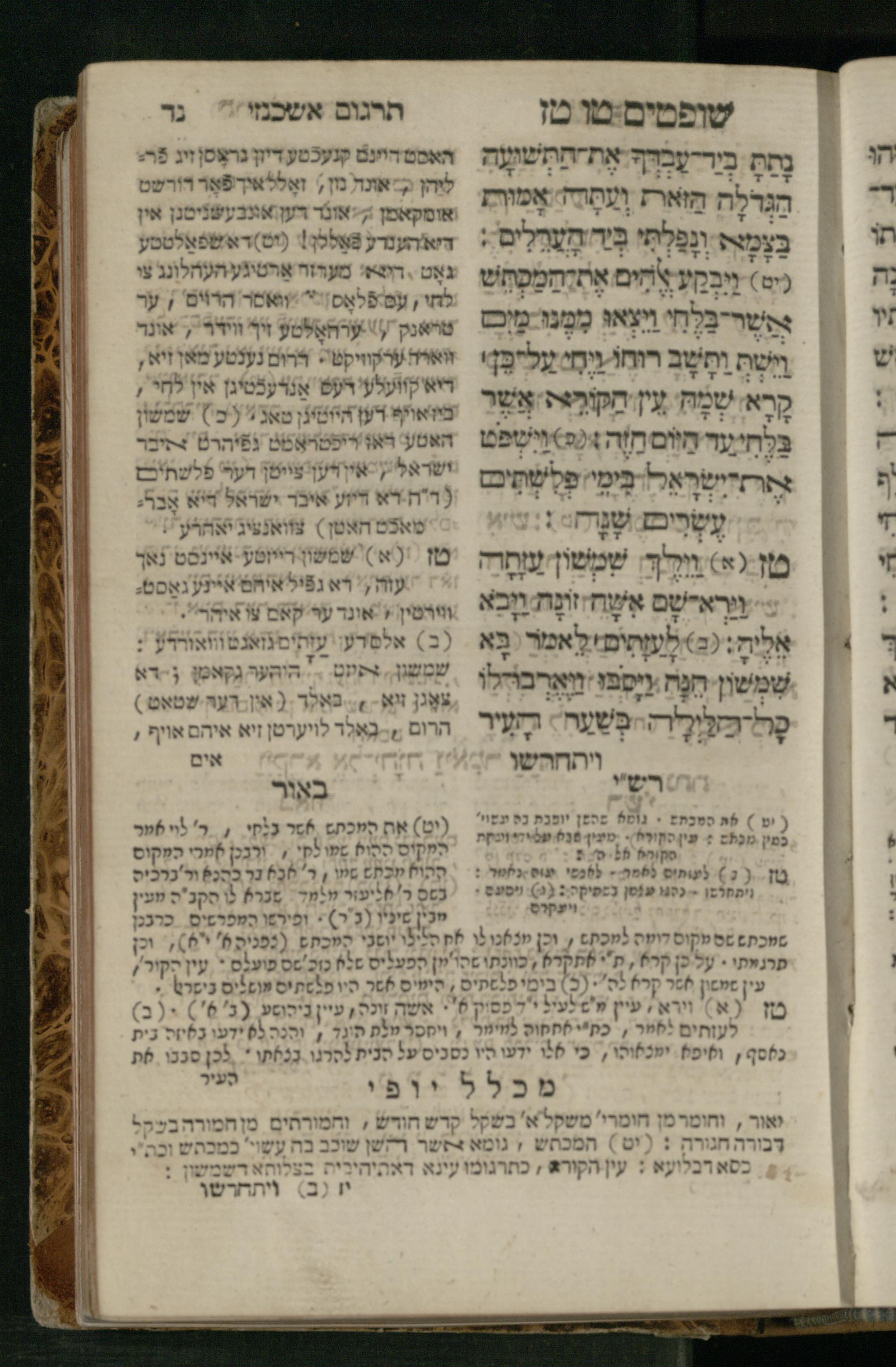 Sefer Shofṭim / ʿim targum Ashkenazi, u-veʾur, meturgam u-mevoʾar me-et R. Meʾir Oborniḳ, ṿe-hosafti bo pe. ... Rashi z.ts.l., ṿe-gam be-khol maḳom she-neʿemar be-perusho milat b.l.ʿa.z., ba be-tsedo ... perusho b.l.A. Ṿe-nilṿeh elaṿ pe. Mikhlal yofi ... ...ספר שופטים / עם תרגום אשכנזי, ובאור, מתורגם ומבואר מאת ר׳ מאיר אברניק, והוספתי בו פי׳... רש״י זצ״ל, וגם בכל מקום שנאמר בפירושו מלת בלע״ז, בא בצידו ... פירושו בל״א. ונלוה אליו פי׳ מכלל יופי ... ...