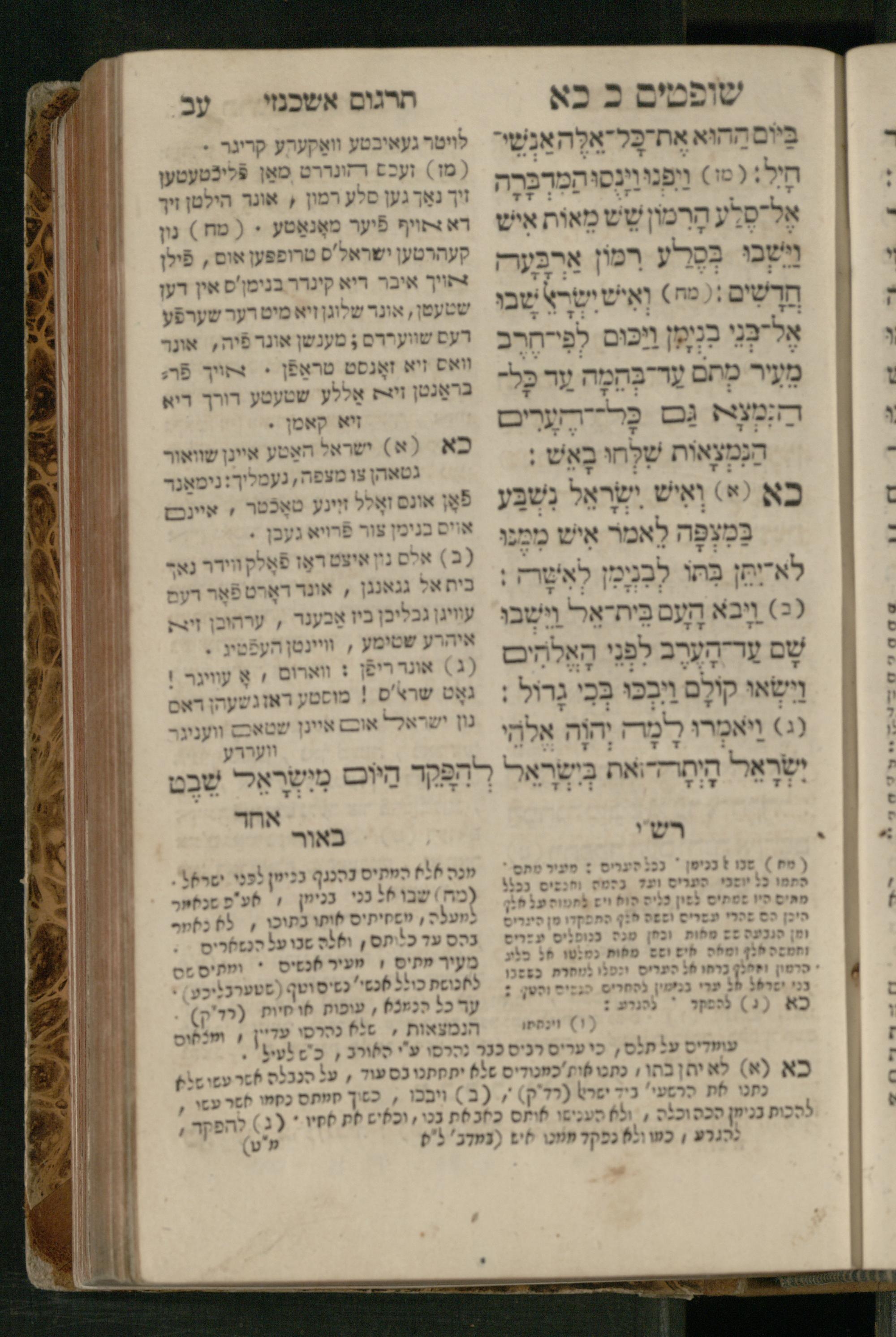 Sefer Shofṭim / ʿim targum Ashkenazi, u-veʾur, meturgam u-mevoʾar me-et R. Meʾir Oborniḳ, ṿe-hosafti bo pe. ... Rashi z.ts.l., ṿe-gam be-khol maḳom she-neʿemar be-perusho milat b.l.ʿa.z., ba be-tsedo ... perusho b.l.A. Ṿe-nilṿeh elaṿ pe. Mikhlal yofi ... ...ספר שופטים / עם תרגום אשכנזי, ובאור, מתורגם ומבואר מאת ר׳ מאיר אברניק, והוספתי בו פי׳... רש״י זצ״ל, וגם בכל מקום שנאמר בפירושו מלת בלע״ז, בא בצידו ... פירושו בל״א. ונלוה אליו פי׳ מכלל יופי ... ...