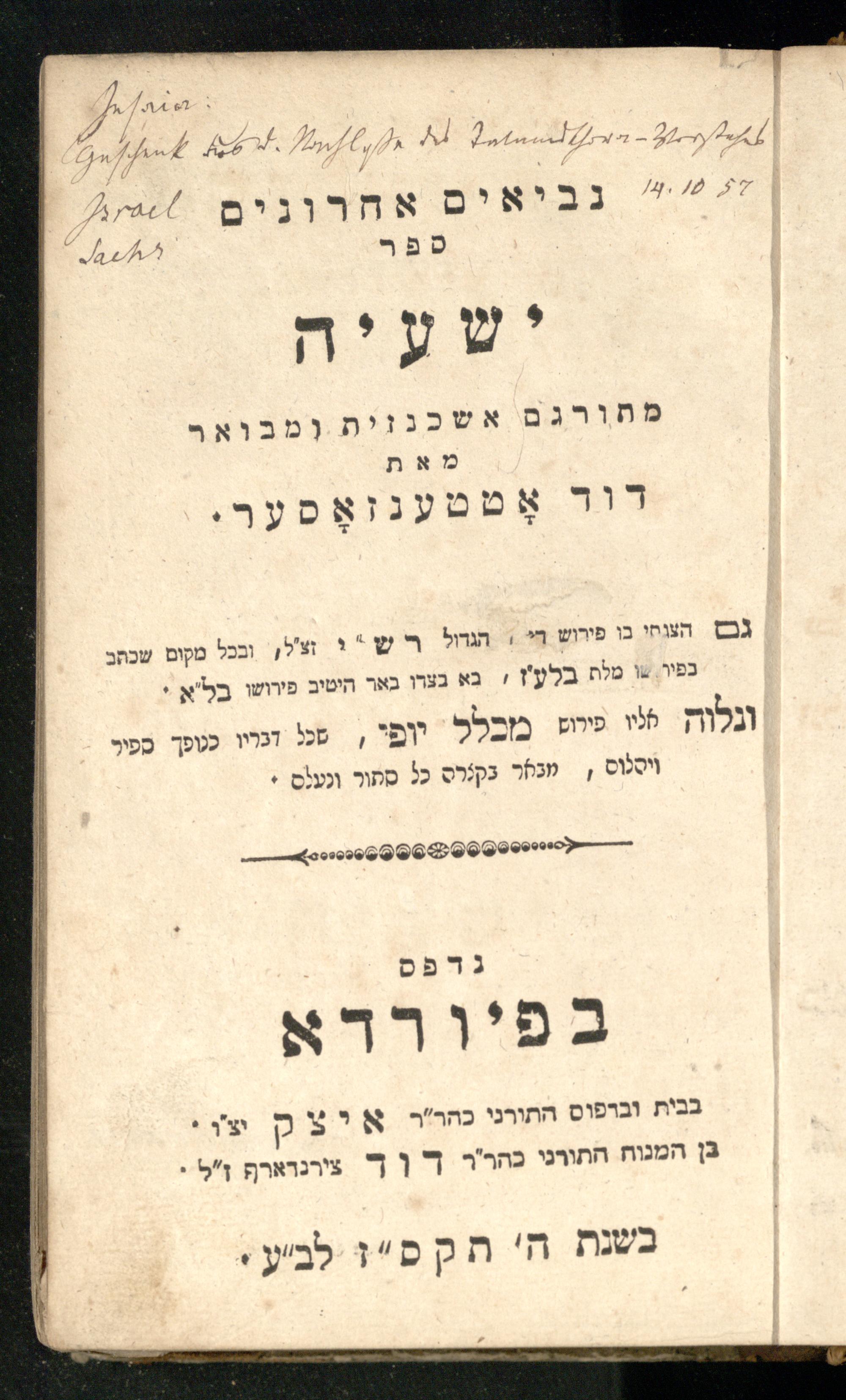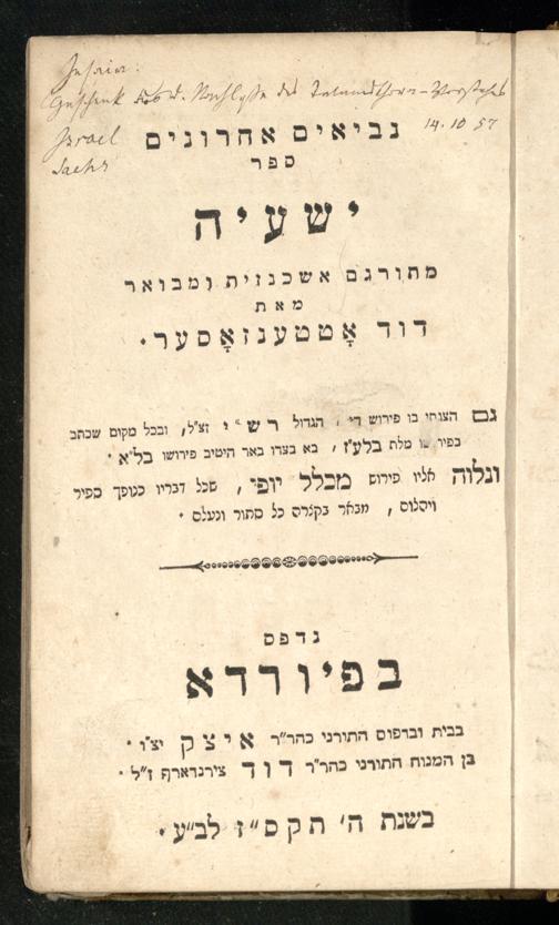 Sefer Yeshaʿyah / meturgam Ashkenazit u-mevoʾar me-et Daṿid Oṭṭenzoser, gam hitsagti bo perush ... Rashi z.ts.l. ... Ṿe-nilṿeh elaṿ perush Mikhlal yofi ...ספר ישעיה / מתורגם אשכנזית ומבואר מאת דוד אטטענזאסער, גם הצגתי בו פירוש ... רש״י זצ״ל ... ונלוה אליו פירוש מכלל יופי ...