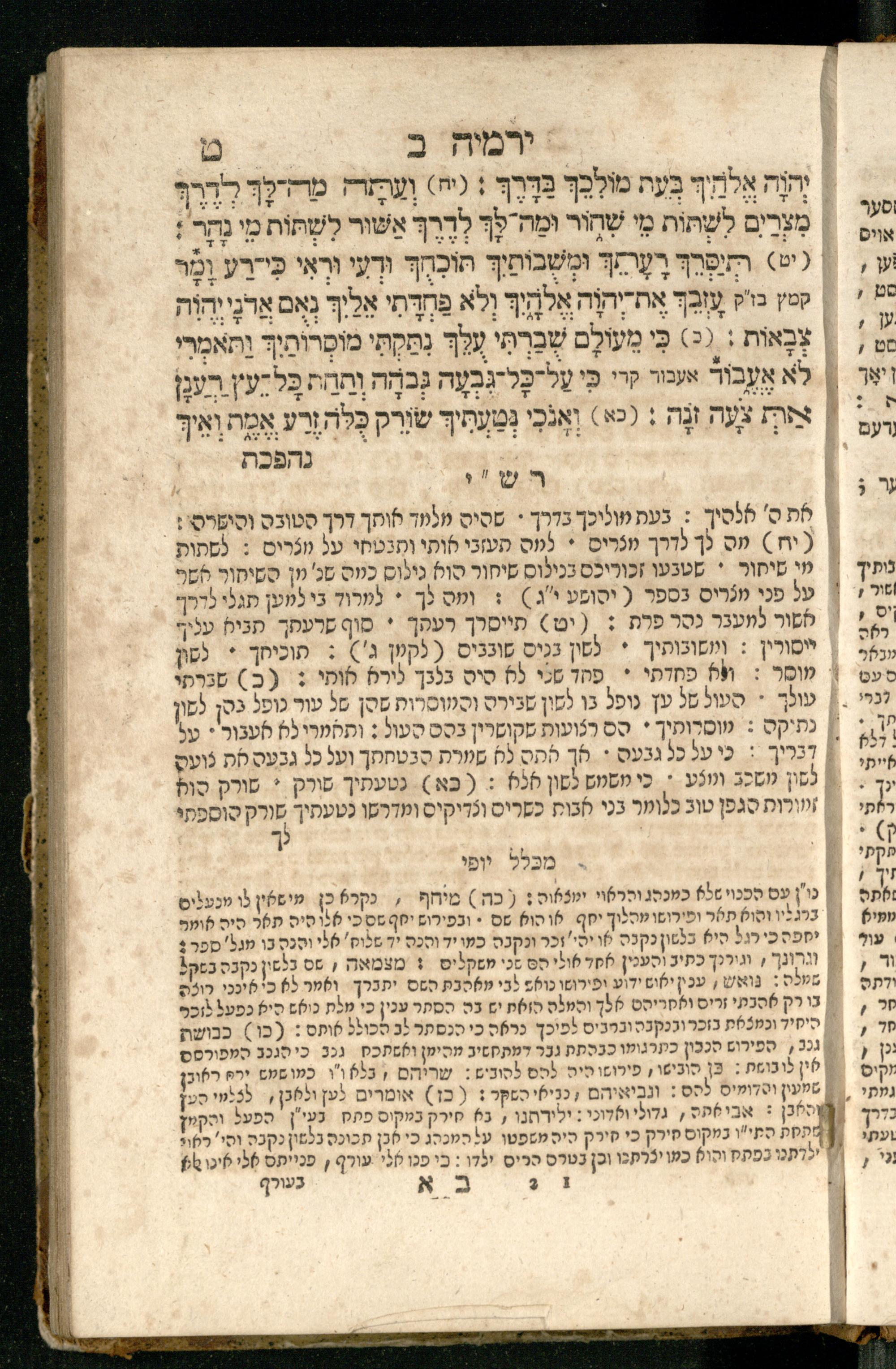 Sefer Yirmeyah / meturgam Ashkenazit u-mevoʾar me-rosh ha-sefer ʿad parashah 11, me-et ... Daṿid Oṭṭenzoser, u-mi-parashah 11 ʿad sof ha-sefer, me-et ... Shalom ha-Kohen n.r.v, gam hitsagti bo perush ... Rashi z.ts.l. ... Ṿe-nilṿeh elaṿ perush Mikhlal yofi ...ספר ירמיה / מתורגם אשכנזית ומבואר מראש הספר עד פרשה י״א, מאת ... דוד אטטענזאסער, ומפרשה י״א עד סוף הספר, מאת ... שלום הכהן נר״ו, גם הצגתי בו פירוש ... רש״י זצ״ל ... ונלוה אליו פירוש מכלל יופי ...