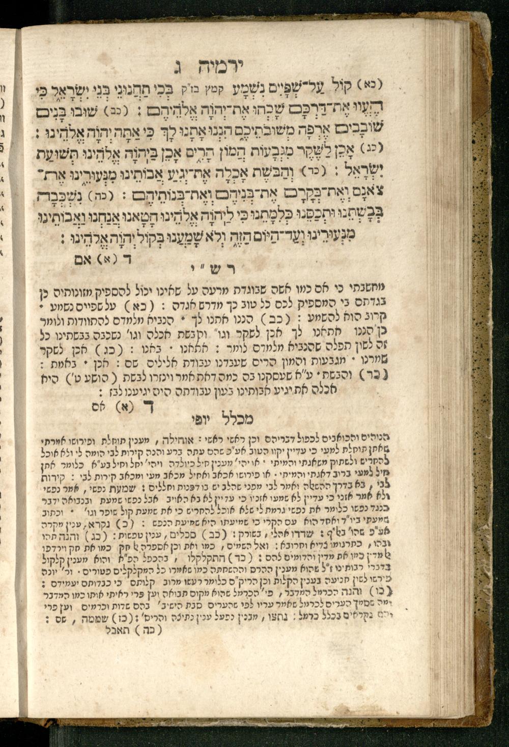Sefer Yirmeyah / meturgam Ashkenazit u-mevoʾar me-rosh ha-sefer ʿad parashah 11, me-et ... Daṿid Oṭṭenzoser, u-mi-parashah 11 ʿad sof ha-sefer, me-et ... Shalom ha-Kohen n.r.v, gam hitsagti bo perush ... Rashi z.ts.l. ... Ṿe-nilṿeh elaṿ perush Mikhlal yofi ...ספר ירמיה / מתורגם אשכנזית ומבואר מראש הספר עד פרשה י״א, מאת ... דוד אטטענזאסער, ומפרשה י״א עד סוף הספר, מאת ... שלום הכהן נר״ו, גם הצגתי בו פירוש ... רש״י זצ״ל ... ונלוה אליו פירוש מכלל יופי ...