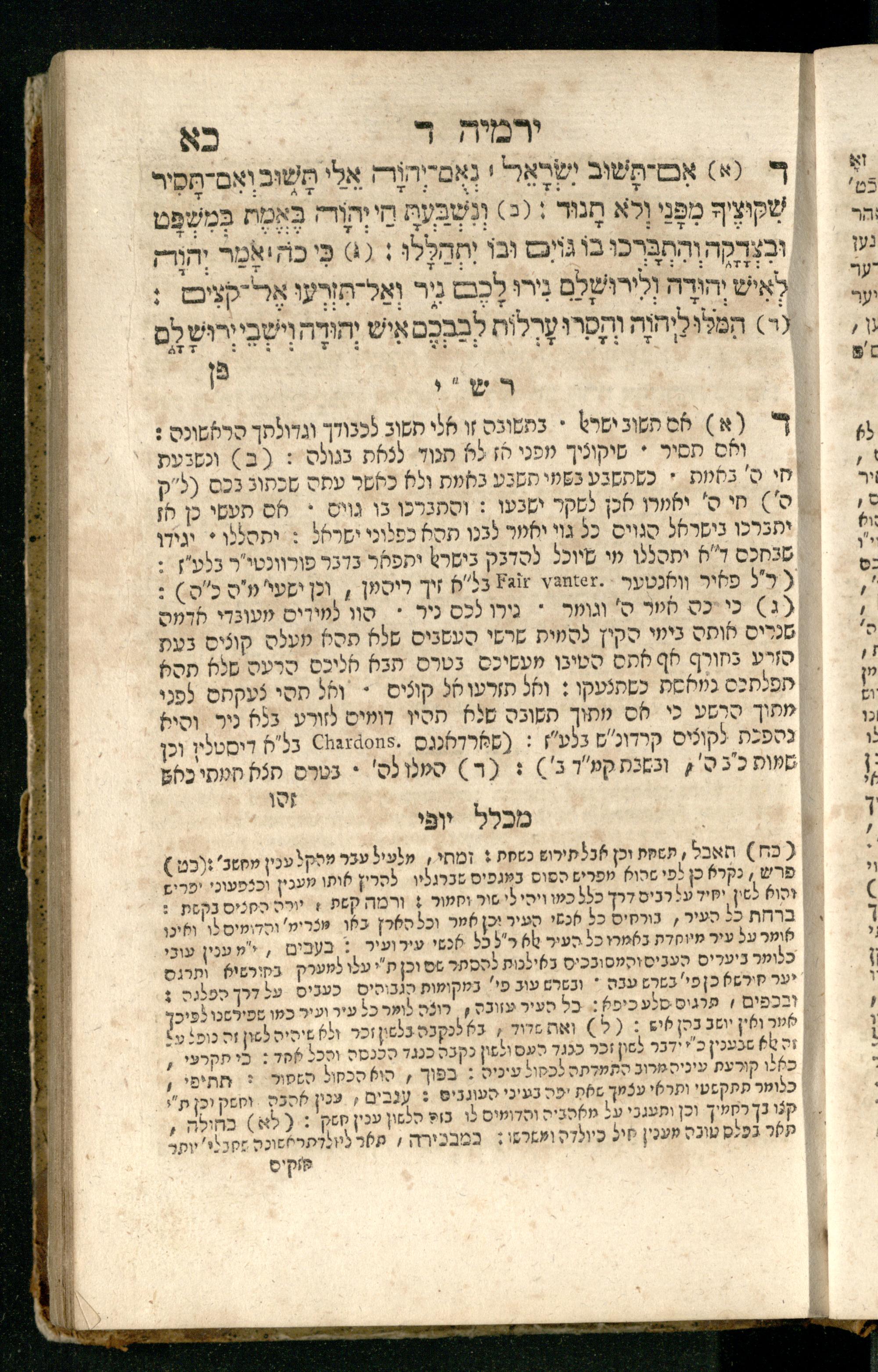 Sefer Yirmeyah / meturgam Ashkenazit u-mevoʾar me-rosh ha-sefer ʿad parashah 11, me-et ... Daṿid Oṭṭenzoser, u-mi-parashah 11 ʿad sof ha-sefer, me-et ... Shalom ha-Kohen n.r.v, gam hitsagti bo perush ... Rashi z.ts.l. ... Ṿe-nilṿeh elaṿ perush Mikhlal yofi ...ספר ירמיה / מתורגם אשכנזית ומבואר מראש הספר עד פרשה י״א, מאת ... דוד אטטענזאסער, ומפרשה י״א עד סוף הספר, מאת ... שלום הכהן נר״ו, גם הצגתי בו פירוש ... רש״י זצ״ל ... ונלוה אליו פירוש מכלל יופי ...