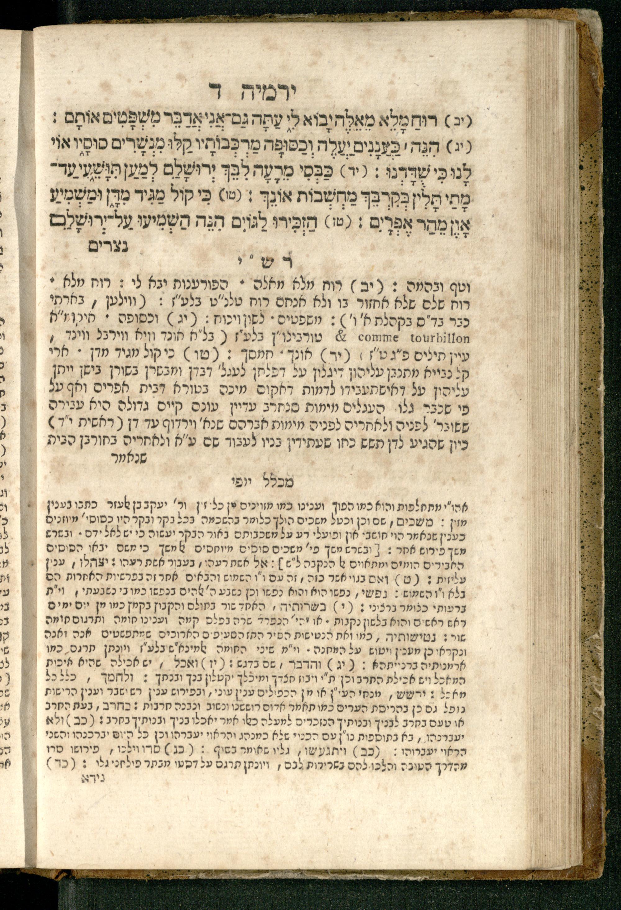 Sefer Yirmeyah / meturgam Ashkenazit u-mevoʾar me-rosh ha-sefer ʿad parashah 11, me-et ... Daṿid Oṭṭenzoser, u-mi-parashah 11 ʿad sof ha-sefer, me-et ... Shalom ha-Kohen n.r.v, gam hitsagti bo perush ... Rashi z.ts.l. ... Ṿe-nilṿeh elaṿ perush Mikhlal yofi ...ספר ירמיה / מתורגם אשכנזית ומבואר מראש הספר עד פרשה י״א, מאת ... דוד אטטענזאסער, ומפרשה י״א עד סוף הספר, מאת ... שלום הכהן נר״ו, גם הצגתי בו פירוש ... רש״י זצ״ל ... ונלוה אליו פירוש מכלל יופי ...