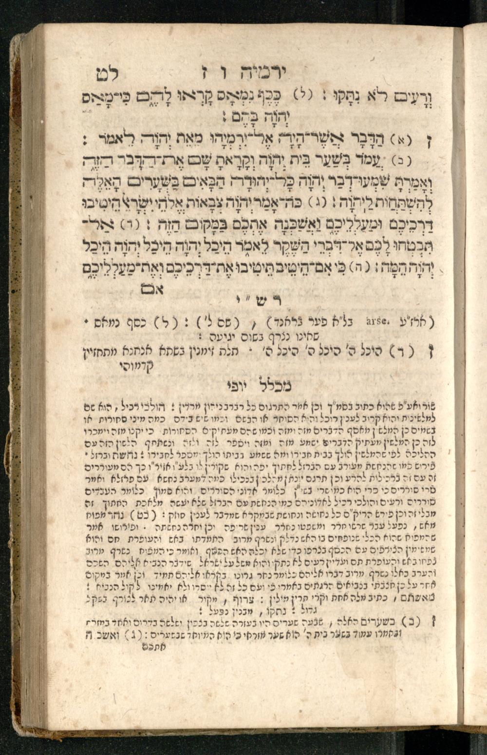 Sefer Yirmeyah / meturgam Ashkenazit u-mevoʾar me-rosh ha-sefer ʿad parashah 11, me-et ... Daṿid Oṭṭenzoser, u-mi-parashah 11 ʿad sof ha-sefer, me-et ... Shalom ha-Kohen n.r.v, gam hitsagti bo perush ... Rashi z.ts.l. ... Ṿe-nilṿeh elaṿ perush Mikhlal yofi ...ספר ירמיה / מתורגם אשכנזית ומבואר מראש הספר עד פרשה י״א, מאת ... דוד אטטענזאסער, ומפרשה י״א עד סוף הספר, מאת ... שלום הכהן נר״ו, גם הצגתי בו פירוש ... רש״י זצ״ל ... ונלוה אליו פירוש מכלל יופי ...