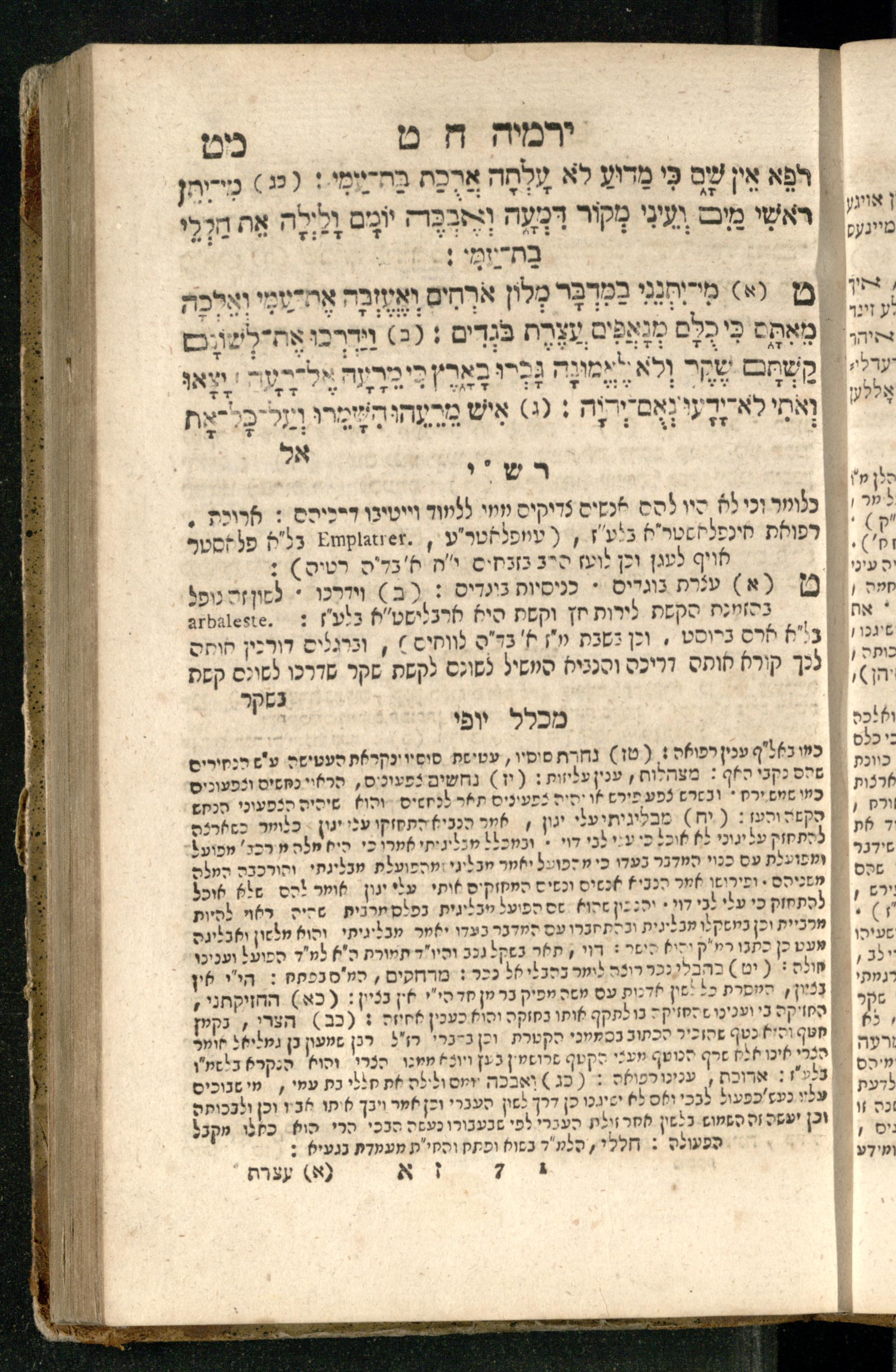 Sefer Yirmeyah / meturgam Ashkenazit u-mevoʾar me-rosh ha-sefer ʿad parashah 11, me-et ... Daṿid Oṭṭenzoser, u-mi-parashah 11 ʿad sof ha-sefer, me-et ... Shalom ha-Kohen n.r.v, gam hitsagti bo perush ... Rashi z.ts.l. ... Ṿe-nilṿeh elaṿ perush Mikhlal yofi ...ספר ירמיה / מתורגם אשכנזית ומבואר מראש הספר עד פרשה י״א, מאת ... דוד אטטענזאסער, ומפרשה י״א עד סוף הספר, מאת ... שלום הכהן נר״ו, גם הצגתי בו פירוש ... רש״י זצ״ל ... ונלוה אליו פירוש מכלל יופי ...