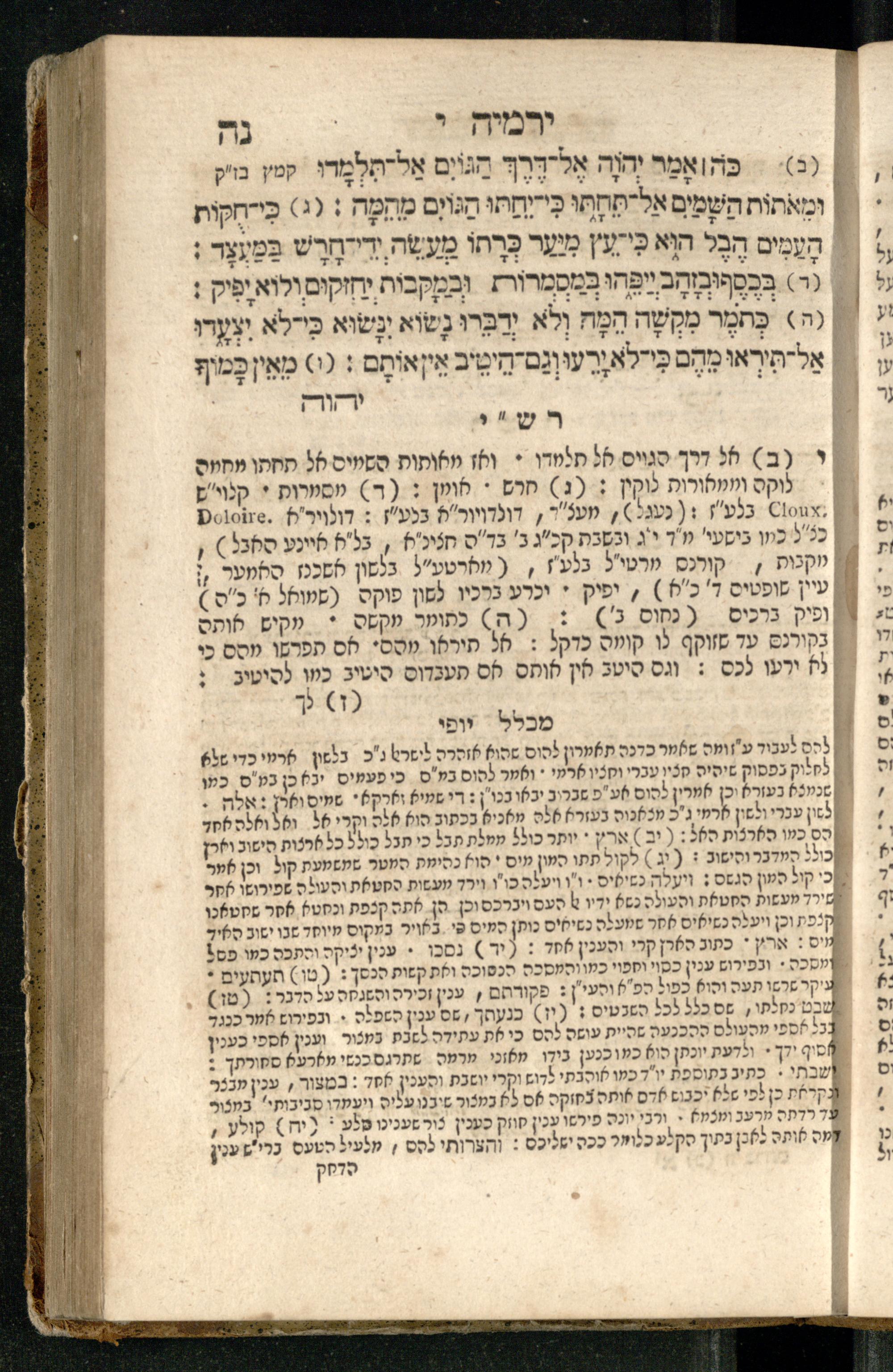 Sefer Yirmeyah / meturgam Ashkenazit u-mevoʾar me-rosh ha-sefer ʿad parashah 11, me-et ... Daṿid Oṭṭenzoser, u-mi-parashah 11 ʿad sof ha-sefer, me-et ... Shalom ha-Kohen n.r.v, gam hitsagti bo perush ... Rashi z.ts.l. ... Ṿe-nilṿeh elaṿ perush Mikhlal yofi ...ספר ירמיה / מתורגם אשכנזית ומבואר מראש הספר עד פרשה י״א, מאת ... דוד אטטענזאסער, ומפרשה י״א עד סוף הספר, מאת ... שלום הכהן נר״ו, גם הצגתי בו פירוש ... רש״י זצ״ל ... ונלוה אליו פירוש מכלל יופי ...