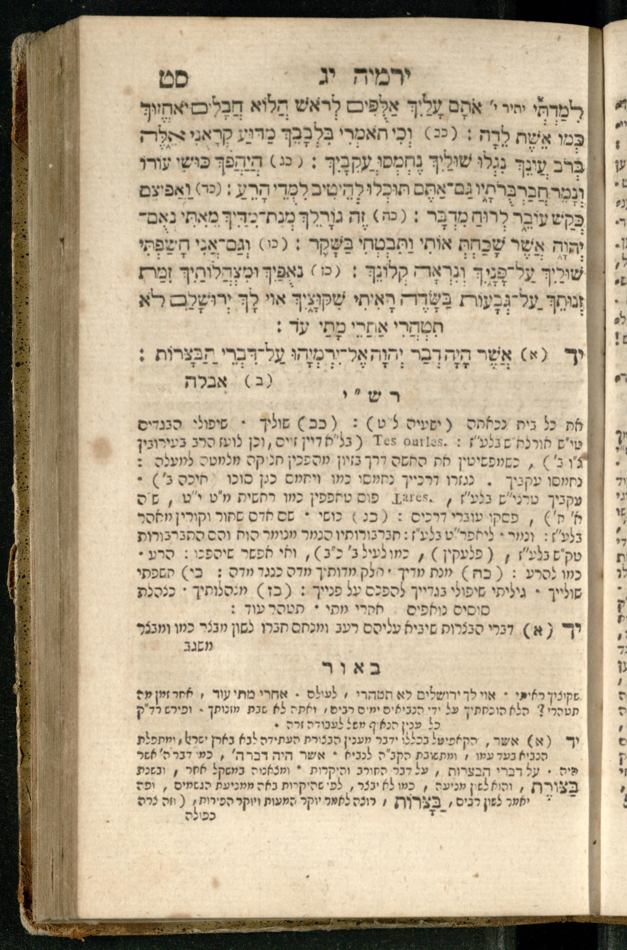 Sefer Yirmeyah / meturgam Ashkenazit u-mevoʾar me-rosh ha-sefer ʿad parashah 11, me-et ... Daṿid Oṭṭenzoser, u-mi-parashah 11 ʿad sof ha-sefer, me-et ... Shalom ha-Kohen n.r.v, gam hitsagti bo perush ... Rashi z.ts.l. ... Ṿe-nilṿeh elaṿ perush Mikhlal yofi ...ספר ירמיה / מתורגם אשכנזית ומבואר מראש הספר עד פרשה י״א, מאת ... דוד אטטענזאסער, ומפרשה י״א עד סוף הספר, מאת ... שלום הכהן נר״ו, גם הצגתי בו פירוש ... רש״י זצ״ל ... ונלוה אליו פירוש מכלל יופי ...