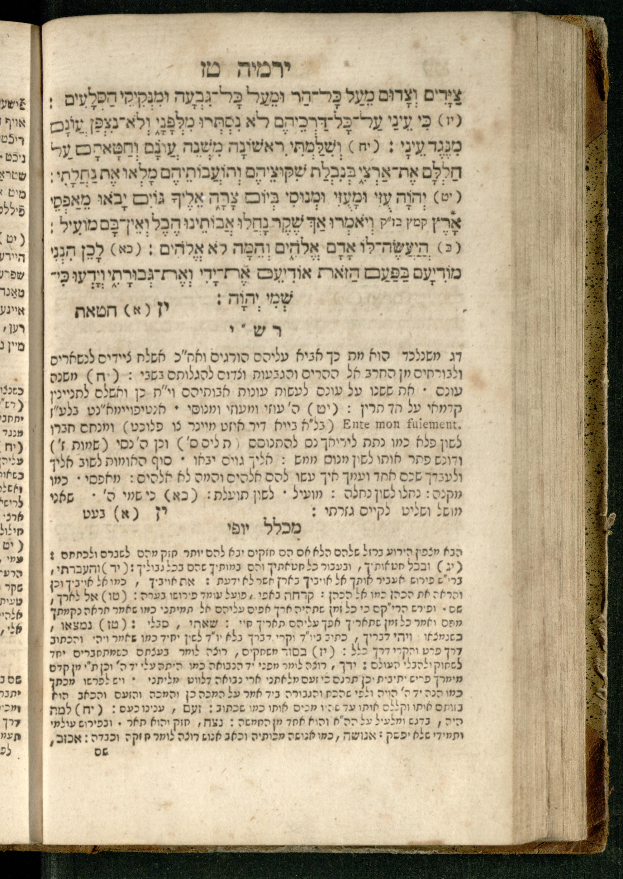 Sefer Yirmeyah / meturgam Ashkenazit u-mevoʾar me-rosh ha-sefer ʿad parashah 11, me-et ... Daṿid Oṭṭenzoser, u-mi-parashah 11 ʿad sof ha-sefer, me-et ... Shalom ha-Kohen n.r.v, gam hitsagti bo perush ... Rashi z.ts.l. ... Ṿe-nilṿeh elaṿ perush Mikhlal yofi ...ספר ירמיה / מתורגם אשכנזית ומבואר מראש הספר עד פרשה י״א, מאת ... דוד אטטענזאסער, ומפרשה י״א עד סוף הספר, מאת ... שלום הכהן נר״ו, גם הצגתי בו פירוש ... רש״י זצ״ל ... ונלוה אליו פירוש מכלל יופי ...