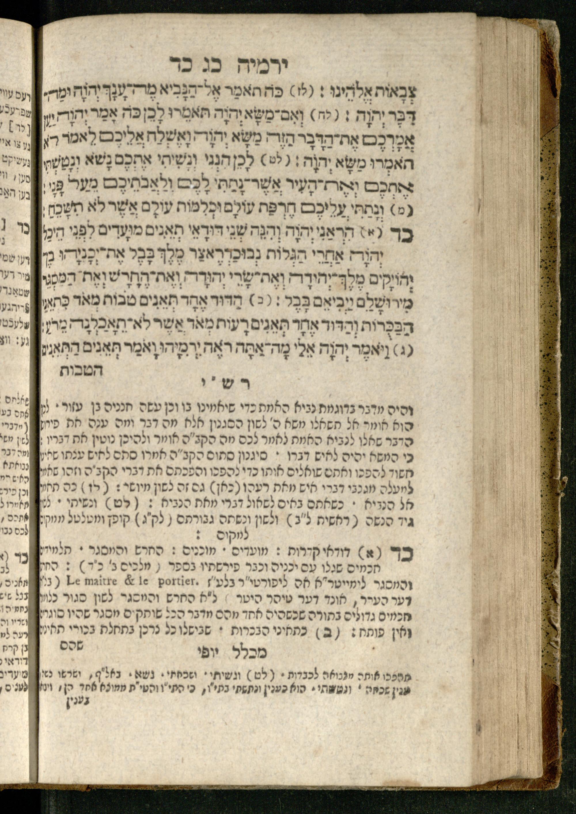 Sefer Yirmeyah / meturgam Ashkenazit u-mevoʾar me-rosh ha-sefer ʿad parashah 11, me-et ... Daṿid Oṭṭenzoser, u-mi-parashah 11 ʿad sof ha-sefer, me-et ... Shalom ha-Kohen n.r.v, gam hitsagti bo perush ... Rashi z.ts.l. ... Ṿe-nilṿeh elaṿ perush Mikhlal yofi ...ספר ירמיה / מתורגם אשכנזית ומבואר מראש הספר עד פרשה י״א, מאת ... דוד אטטענזאסער, ומפרשה י״א עד סוף הספר, מאת ... שלום הכהן נר״ו, גם הצגתי בו פירוש ... רש״י זצ״ל ... ונלוה אליו פירוש מכלל יופי ...