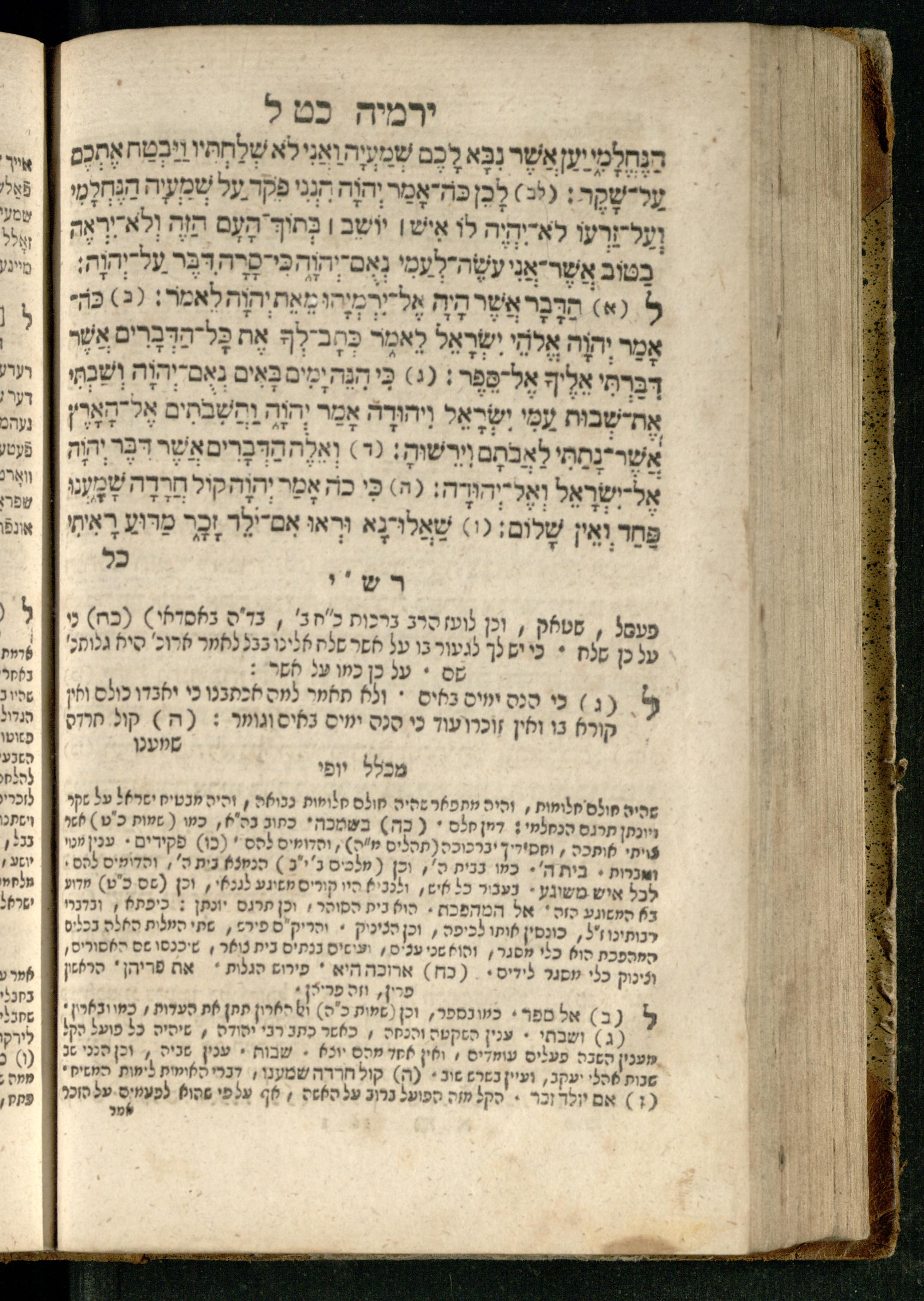Sefer Yirmeyah / meturgam Ashkenazit u-mevoʾar me-rosh ha-sefer ʿad parashah 11, me-et ... Daṿid Oṭṭenzoser, u-mi-parashah 11 ʿad sof ha-sefer, me-et ... Shalom ha-Kohen n.r.v, gam hitsagti bo perush ... Rashi z.ts.l. ... Ṿe-nilṿeh elaṿ perush Mikhlal yofi ...ספר ירמיה / מתורגם אשכנזית ומבואר מראש הספר עד פרשה י״א, מאת ... דוד אטטענזאסער, ומפרשה י״א עד סוף הספר, מאת ... שלום הכהן נר״ו, גם הצגתי בו פירוש ... רש״י זצ״ל ... ונלוה אליו פירוש מכלל יופי ...