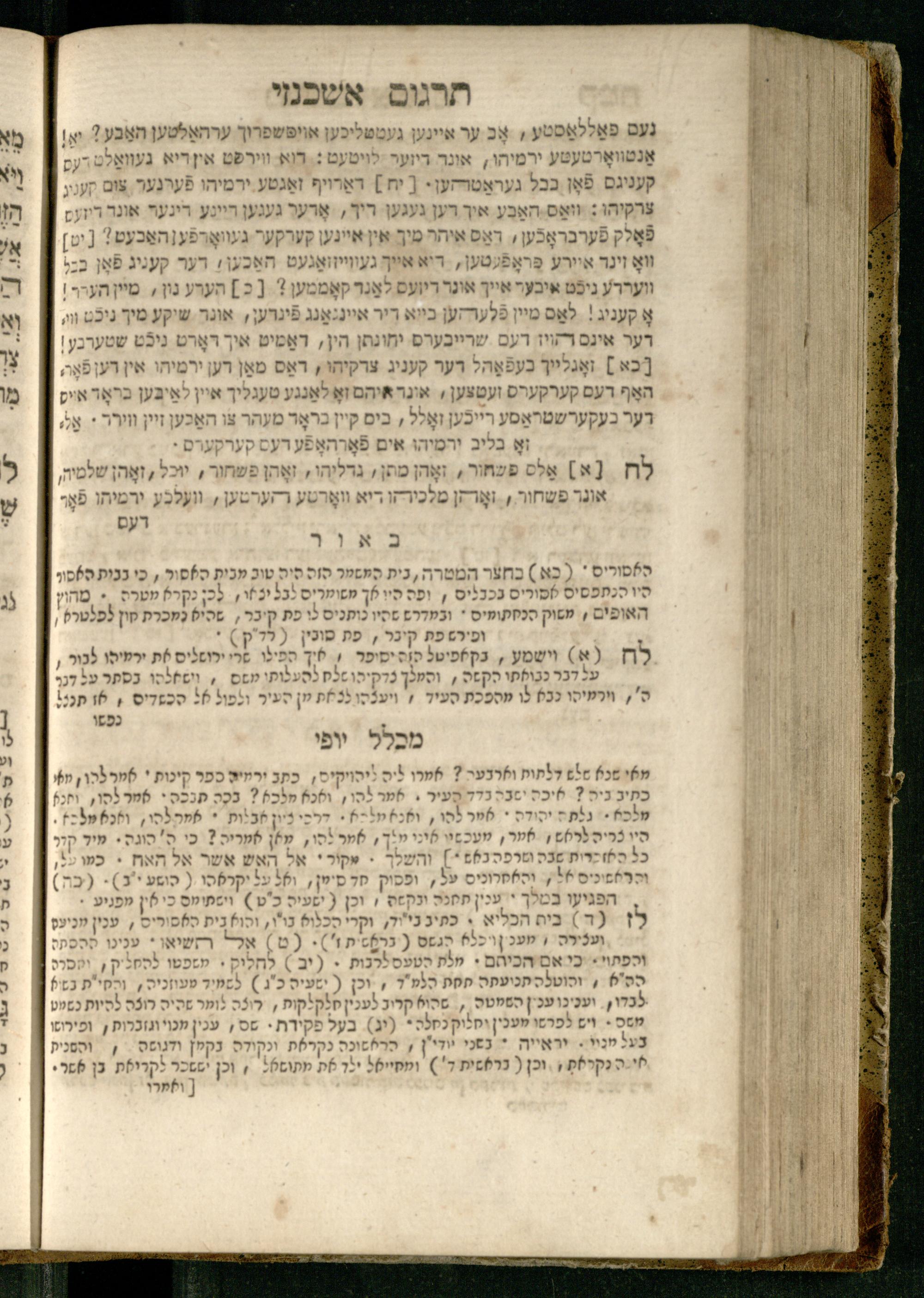 Sefer Yirmeyah / meturgam Ashkenazit u-mevoʾar me-rosh ha-sefer ʿad parashah 11, me-et ... Daṿid Oṭṭenzoser, u-mi-parashah 11 ʿad sof ha-sefer, me-et ... Shalom ha-Kohen n.r.v, gam hitsagti bo perush ... Rashi z.ts.l. ... Ṿe-nilṿeh elaṿ perush Mikhlal yofi ...ספר ירמיה / מתורגם אשכנזית ומבואר מראש הספר עד פרשה י״א, מאת ... דוד אטטענזאסער, ומפרשה י״א עד סוף הספר, מאת ... שלום הכהן נר״ו, גם הצגתי בו פירוש ... רש״י זצ״ל ... ונלוה אליו פירוש מכלל יופי ...