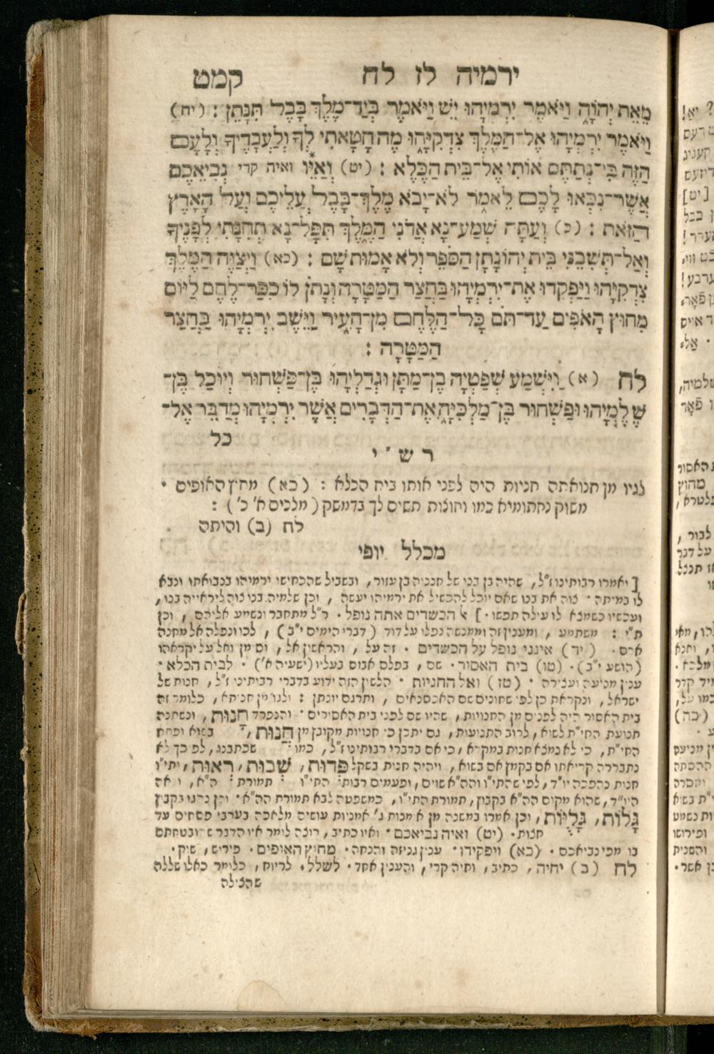Sefer Yirmeyah / meturgam Ashkenazit u-mevoʾar me-rosh ha-sefer ʿad parashah 11, me-et ... Daṿid Oṭṭenzoser, u-mi-parashah 11 ʿad sof ha-sefer, me-et ... Shalom ha-Kohen n.r.v, gam hitsagti bo perush ... Rashi z.ts.l. ... Ṿe-nilṿeh elaṿ perush Mikhlal yofi ...ספר ירמיה / מתורגם אשכנזית ומבואר מראש הספר עד פרשה י״א, מאת ... דוד אטטענזאסער, ומפרשה י״א עד סוף הספר, מאת ... שלום הכהן נר״ו, גם הצגתי בו פירוש ... רש״י זצ״ל ... ונלוה אליו פירוש מכלל יופי ...