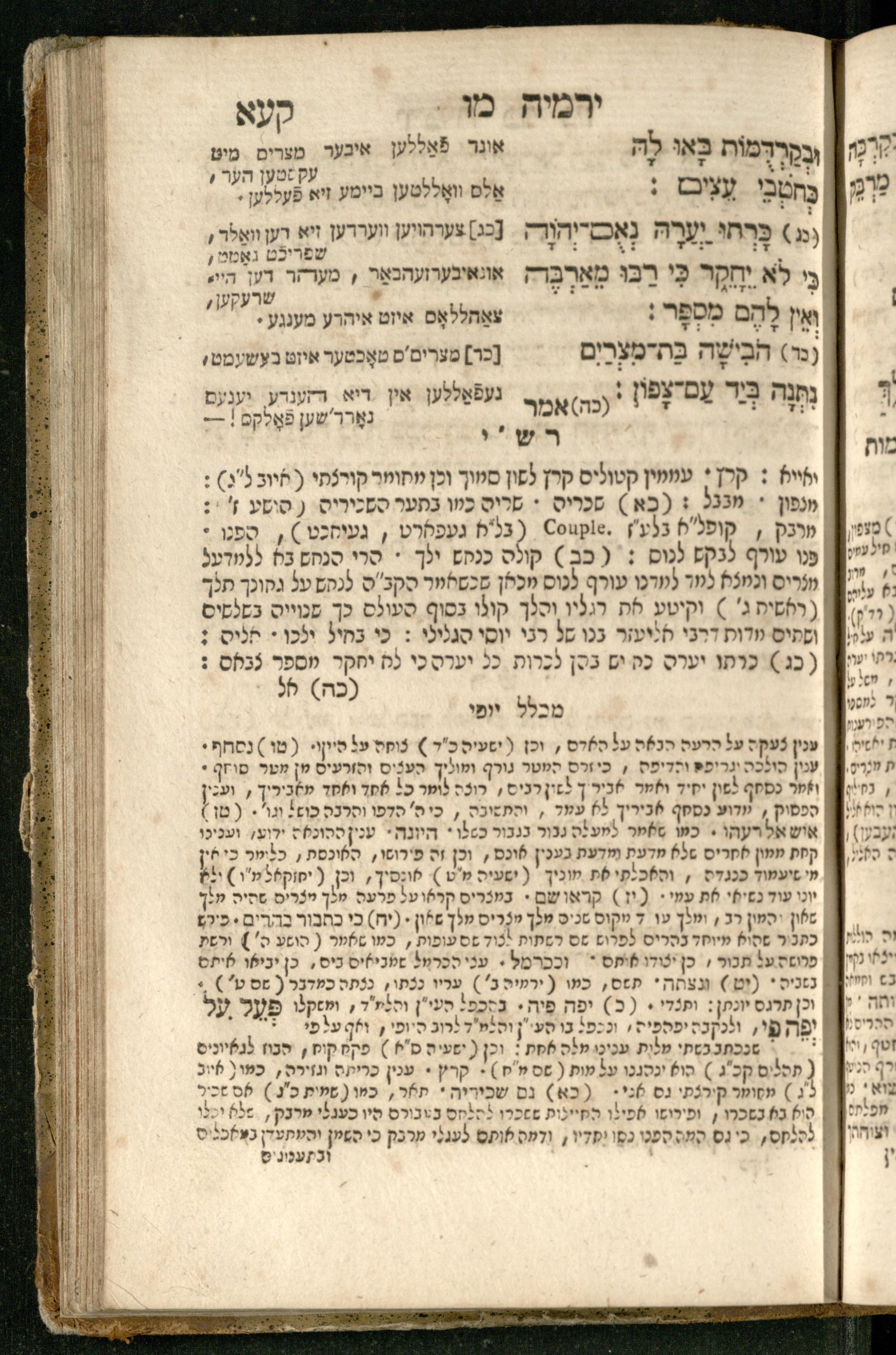 Sefer Yirmeyah / meturgam Ashkenazit u-mevoʾar me-rosh ha-sefer ʿad parashah 11, me-et ... Daṿid Oṭṭenzoser, u-mi-parashah 11 ʿad sof ha-sefer, me-et ... Shalom ha-Kohen n.r.v, gam hitsagti bo perush ... Rashi z.ts.l. ... Ṿe-nilṿeh elaṿ perush Mikhlal yofi ...ספר ירמיה / מתורגם אשכנזית ומבואר מראש הספר עד פרשה י״א, מאת ... דוד אטטענזאסער, ומפרשה י״א עד סוף הספר, מאת ... שלום הכהן נר״ו, גם הצגתי בו פירוש ... רש״י זצ״ל ... ונלוה אליו פירוש מכלל יופי ...