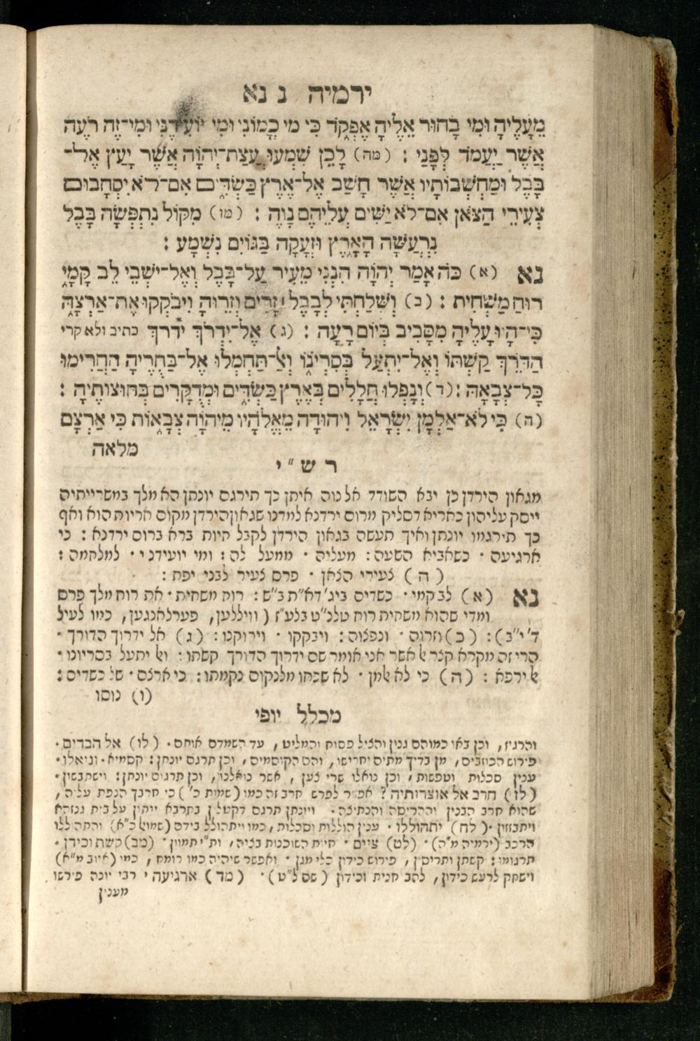 Sefer Yirmeyah / meturgam Ashkenazit u-mevoʾar me-rosh ha-sefer ʿad parashah 11, me-et ... Daṿid Oṭṭenzoser, u-mi-parashah 11 ʿad sof ha-sefer, me-et ... Shalom ha-Kohen n.r.v, gam hitsagti bo perush ... Rashi z.ts.l. ... Ṿe-nilṿeh elaṿ perush Mikhlal yofi ...ספר ירמיה / מתורגם אשכנזית ומבואר מראש הספר עד פרשה י״א, מאת ... דוד אטטענזאסער, ומפרשה י״א עד סוף הספר, מאת ... שלום הכהן נר״ו, גם הצגתי בו פירוש ... רש״י זצ״ל ... ונלוה אליו פירוש מכלל יופי ...
