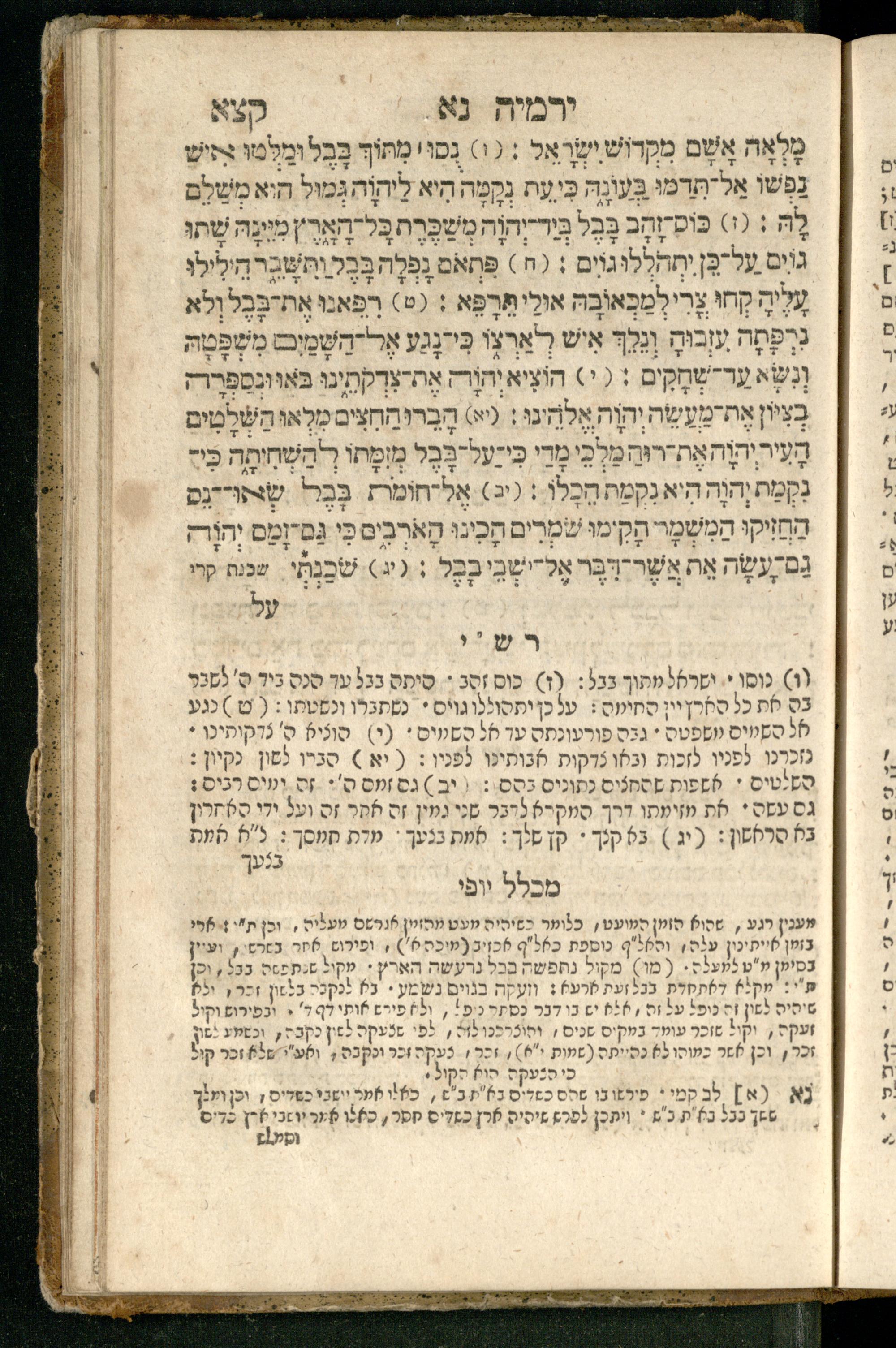 Sefer Yirmeyah / meturgam Ashkenazit u-mevoʾar me-rosh ha-sefer ʿad parashah 11, me-et ... Daṿid Oṭṭenzoser, u-mi-parashah 11 ʿad sof ha-sefer, me-et ... Shalom ha-Kohen n.r.v, gam hitsagti bo perush ... Rashi z.ts.l. ... Ṿe-nilṿeh elaṿ perush Mikhlal yofi ...ספר ירמיה / מתורגם אשכנזית ומבואר מראש הספר עד פרשה י״א, מאת ... דוד אטטענזאסער, ומפרשה י״א עד סוף הספר, מאת ... שלום הכהן נר״ו, גם הצגתי בו פירוש ... רש״י זצ״ל ... ונלוה אליו פירוש מכלל יופי ...
