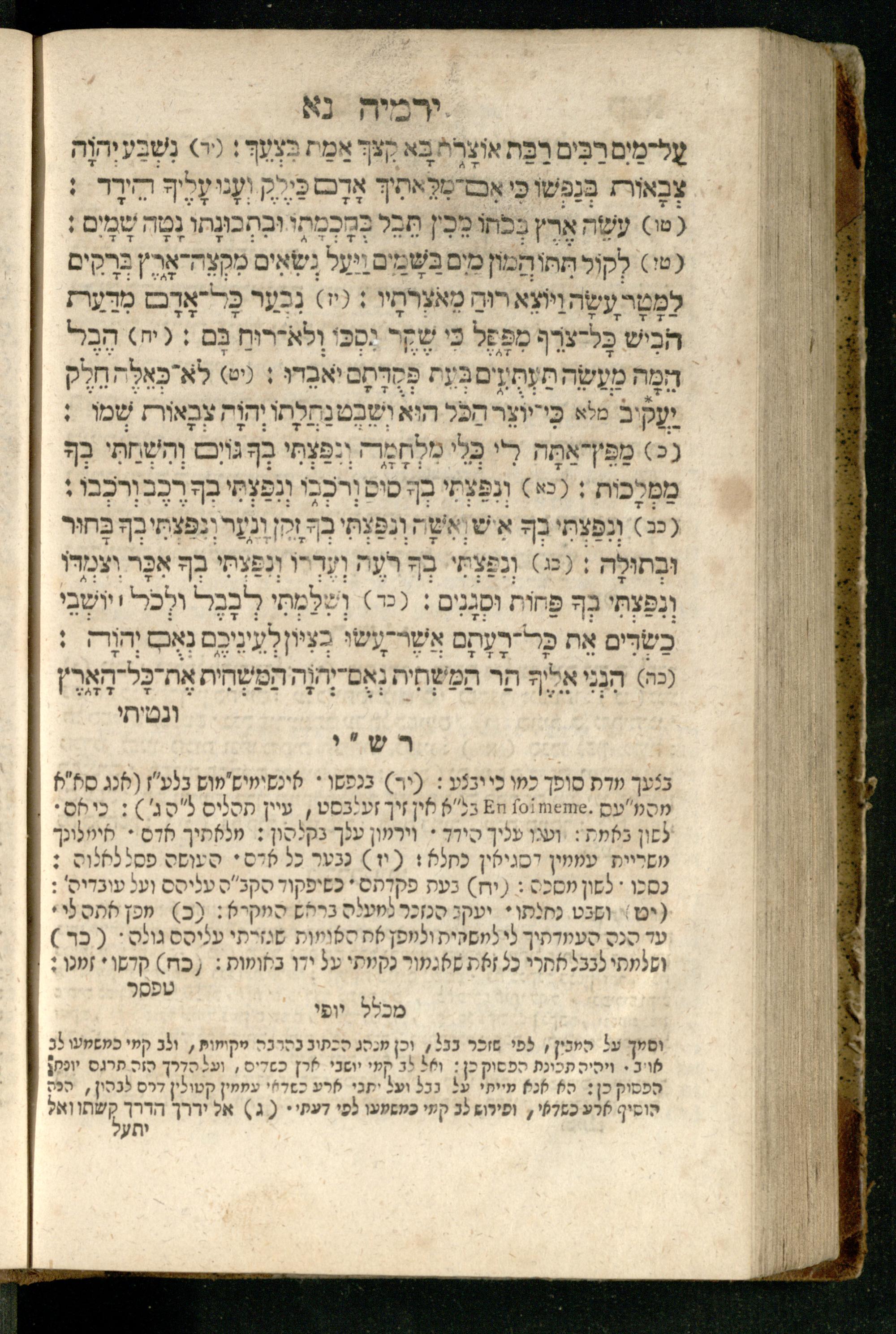 Sefer Yirmeyah / meturgam Ashkenazit u-mevoʾar me-rosh ha-sefer ʿad parashah 11, me-et ... Daṿid Oṭṭenzoser, u-mi-parashah 11 ʿad sof ha-sefer, me-et ... Shalom ha-Kohen n.r.v, gam hitsagti bo perush ... Rashi z.ts.l. ... Ṿe-nilṿeh elaṿ perush Mikhlal yofi ...ספר ירמיה / מתורגם אשכנזית ומבואר מראש הספר עד פרשה י״א, מאת ... דוד אטטענזאסער, ומפרשה י״א עד סוף הספר, מאת ... שלום הכהן נר״ו, גם הצגתי בו פירוש ... רש״י זצ״ל ... ונלוה אליו פירוש מכלל יופי ...