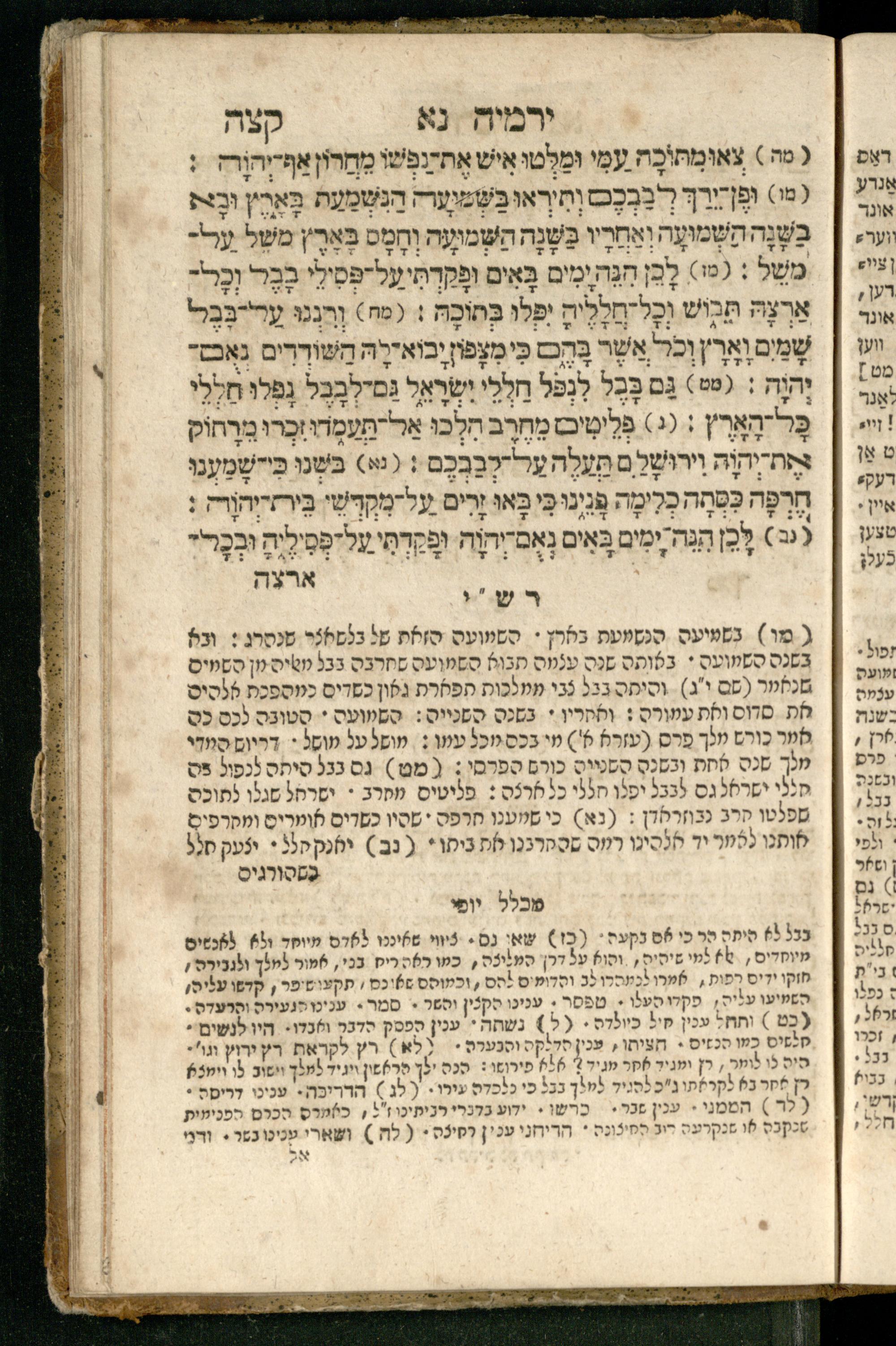 Sefer Yirmeyah / meturgam Ashkenazit u-mevoʾar me-rosh ha-sefer ʿad parashah 11, me-et ... Daṿid Oṭṭenzoser, u-mi-parashah 11 ʿad sof ha-sefer, me-et ... Shalom ha-Kohen n.r.v, gam hitsagti bo perush ... Rashi z.ts.l. ... Ṿe-nilṿeh elaṿ perush Mikhlal yofi ...ספר ירמיה / מתורגם אשכנזית ומבואר מראש הספר עד פרשה י״א, מאת ... דוד אטטענזאסער, ומפרשה י״א עד סוף הספר, מאת ... שלום הכהן נר״ו, גם הצגתי בו פירוש ... רש״י זצ״ל ... ונלוה אליו פירוש מכלל יופי ...