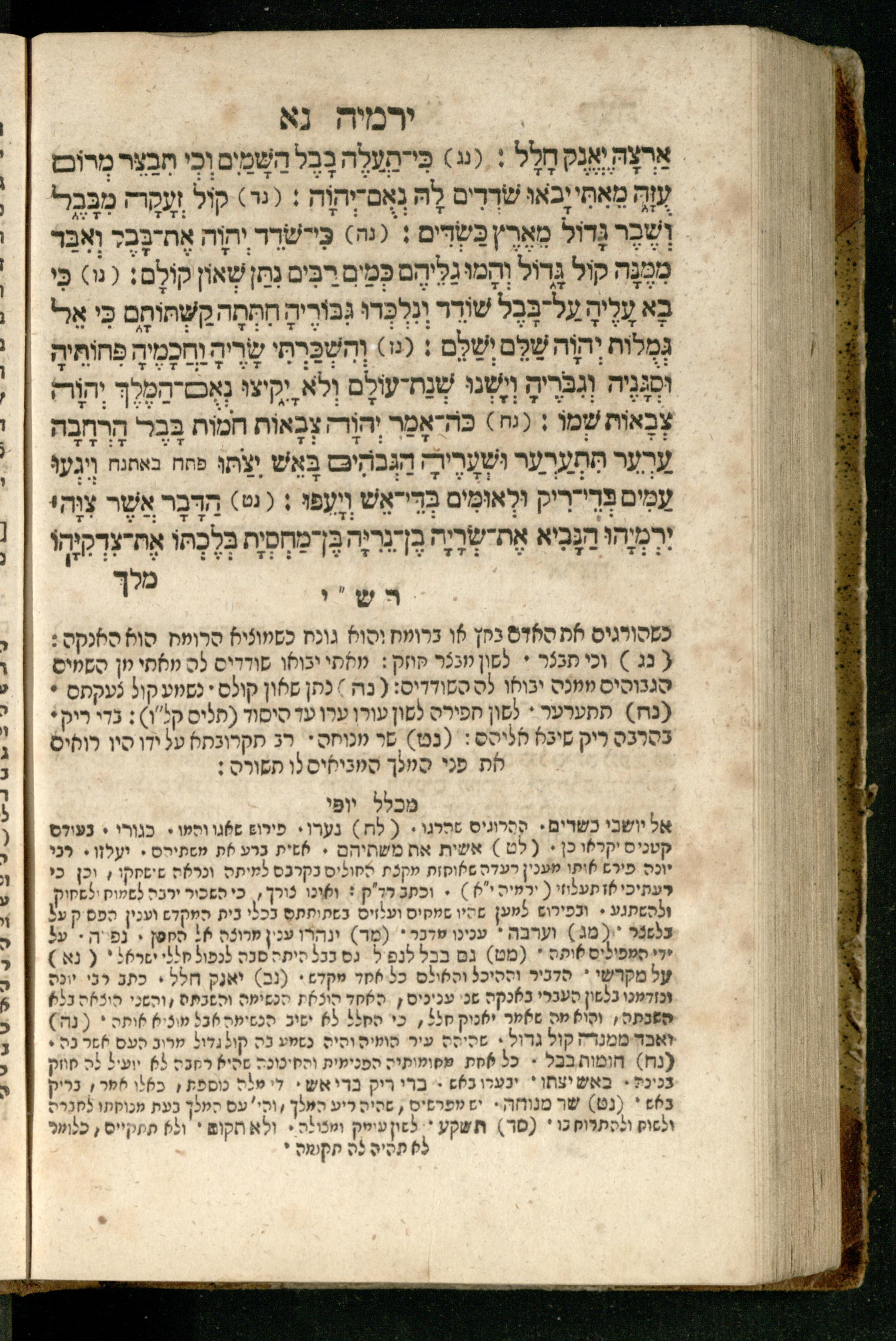 Sefer Yirmeyah / meturgam Ashkenazit u-mevoʾar me-rosh ha-sefer ʿad parashah 11, me-et ... Daṿid Oṭṭenzoser, u-mi-parashah 11 ʿad sof ha-sefer, me-et ... Shalom ha-Kohen n.r.v, gam hitsagti bo perush ... Rashi z.ts.l. ... Ṿe-nilṿeh elaṿ perush Mikhlal yofi ...ספר ירמיה / מתורגם אשכנזית ומבואר מראש הספר עד פרשה י״א, מאת ... דוד אטטענזאסער, ומפרשה י״א עד סוף הספר, מאת ... שלום הכהן נר״ו, גם הצגתי בו פירוש ... רש״י זצ״ל ... ונלוה אליו פירוש מכלל יופי ...