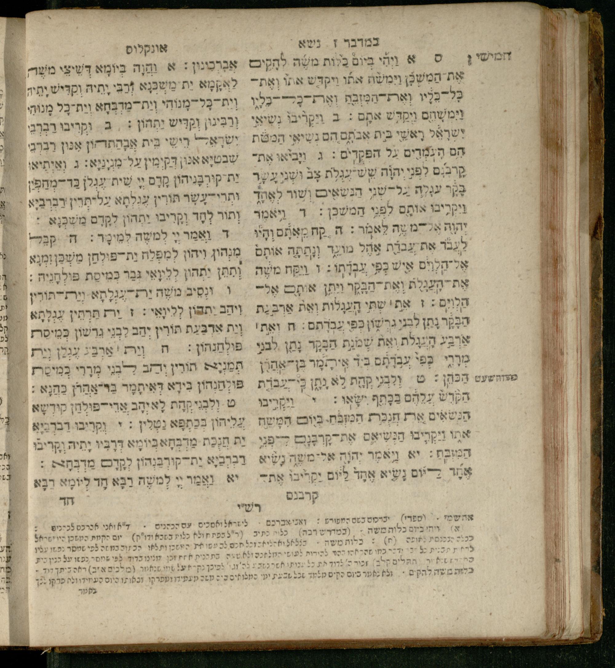 Sefer Ba-midbar : ʿim 3 targumim ... pe. Rashi, u-ferush Rashbam u-ferush Mikhlal yofi min R. Shelomoh ben Melekh u-ferush Beʾer reḥovot ʿal diḳduḳe Rashi ... ṿe-Sefer ha-Ḥinukh me-Rabenu Aharon ha-Leṿi ... / huva le-vet ha-defus ʿa.y. ha-torani ha-mufla mo.h.r.R. Pinḥas Eliyahu ben ha-torani ha-manhig mo.h.r.R. Ḥayim Kats u-veno ha-torani ha-mufla mo.h.r.R. Shemuʾel Kats mi-ḳ.ḳ. Ṿilnaספר במדבר : עם ג׳ תרגומים ... פירש״י, ופירוש רש״בם ופירוש מכלל יופי מן ר׳ שלמה בן מלך ופירוש באר רחובות על דקדוקי רש״י ... וספר החינוך מרבינו אהרן הלוי ... / הובא לבית הדפוס ע״י התורני המופלא מוה״רר פנחס אליהו בן התורני המנהיג מוה״רר חיים כ״ץ ובנו התורני המופלא מוה״רר שמואל כ״ץ מק״ק ווילנא