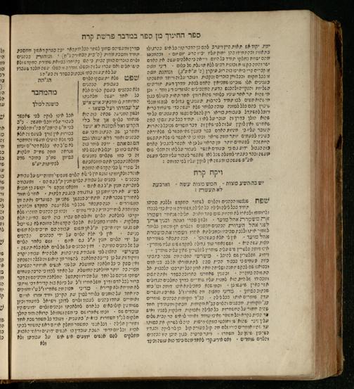 Sefer Ba-midbar : ʿim 3 targumim ... pe. Rashi, u-ferush Rashbam u-ferush Mikhlal yofi min R. Shelomoh ben Melekh u-ferush Beʾer reḥovot ʿal diḳduḳe Rashi ... ṿe-Sefer ha-Ḥinukh me-Rabenu Aharon ha-Leṿi ... / huva le-vet ha-defus ʿa.y. ha-torani ha-mufla mo.h.r.R. Pinḥas Eliyahu ben ha-torani ha-manhig mo.h.r.R. Ḥayim Kats u-veno ha-torani ha-mufla mo.h.r.R. Shemuʾel Kats mi-ḳ.ḳ. Ṿilnaספר במדבר : עם ג׳ תרגומים ... פירש״י, ופירוש רש״בם ופירוש מכלל יופי מן ר׳ שלמה בן מלך ופירוש באר רחובות על דקדוקי רש״י ... וספר החינוך מרבינו אהרן הלוי ... / הובא לבית הדפוס ע״י התורני המופלא מוה״רר פנחס אליהו בן התורני המנהיג מוה״רר חיים כ״ץ ובנו התורני המופלא מוה״רר שמואל כ״ץ מק״ק ווילנא