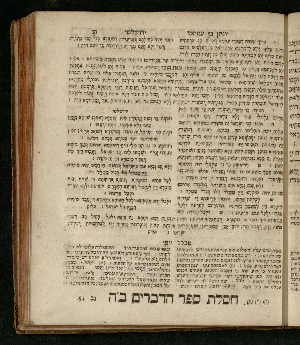 Sefer Devarim : ʿim 3 targumim ... pe. Rashi, u-ferush Rashbam u-ferush Mikhlal yofi min R. Shelomoh ben Melekh u-ferush Beʾer reḥovot ʿal diḳduḳe Rashi ... ṿe-Sefer ha-Ḥinukh me-Rabenu Aharon ha-Leṿi ... / huva le-vet ha-defus ʿa.y. ha-torani ha-mufla mo.h.r.R. Pinḥas Eliyahu ben ha-torani ha-manhig mo.h.r.R. Ḥayim Kats u-veno ha-torani ha-mufla mo.h.r.R. Shemuʾel Kats mi-ḳ.ḳ. Ṿilnaספר דברים : עם ג׳ תרגומים ... פירש״י, ופירוש רש״בם ופירוש מכלל יופי מן ר׳ שלמה בן מלך ופירוש באר רחובות על דקדוקי רש״י ... וספר החינוך מרבינו אהרן הלוי ... / הובא לבית הדפוס ע״י התורני המופלא מוה״רר פנחס אליהו בן התורני המנהיג מוה״רר חיים כ״ץ ובנו התורני המופלא מוה״רר שמואל כ״ץ מק״ק ווילנא