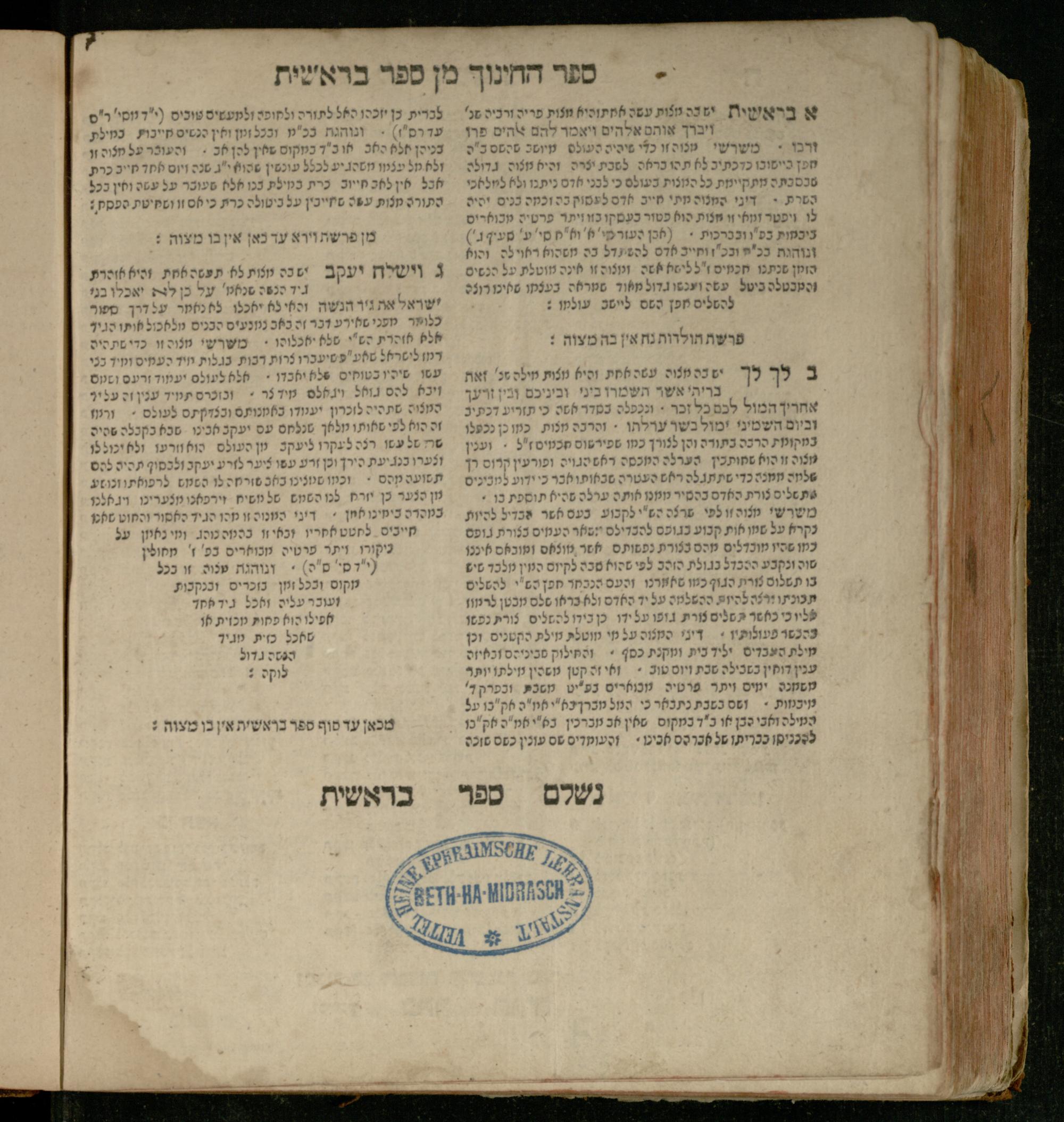Sefer Be-reshit : ʿim 3 targumim ... pe. Rashi, u-ferush Rashbam u-ferush Mikhlal yofi min R. Shelomoh ben Melekh u-ferush Beʾer reḥovot ʿal diḳduḳe Rashi ... ṿe-Sefer ha-Ḥinukh me-Rabenu Aharon ha-Leṿi ... / huva le-vet ha-defus ʿa.y. ha-torani ha-mufla mo.h.r.R. Pinḥas Eliyahu ben ha-torani ha-manhig mo.h.r.R. Ḥayim Kats u-veno ha-torani ha-mufla mo.h.r.R. Shemuʾel Kats mi-ḳ.ḳ. Ṿilnaספר בראשית : עם ג׳ תרגומים ... פירש״י, ופירוש רש״בם ופירוש מכלל יופי מן ר׳ שלמה בן מלך ופירוש באר רחובות על דקדוקי רש״י ... וספר החינוך מרבינו אהרן הלוי ... / הובא לבית הדפוס ע״י התורני המופלא מוה״רר פנחס אליהו בן התורני המנהיג מוה״רר חיים כ״ץ ובנו התורני המופלא מוה״רר שמואל כ״ץ מק״ק ווילנא