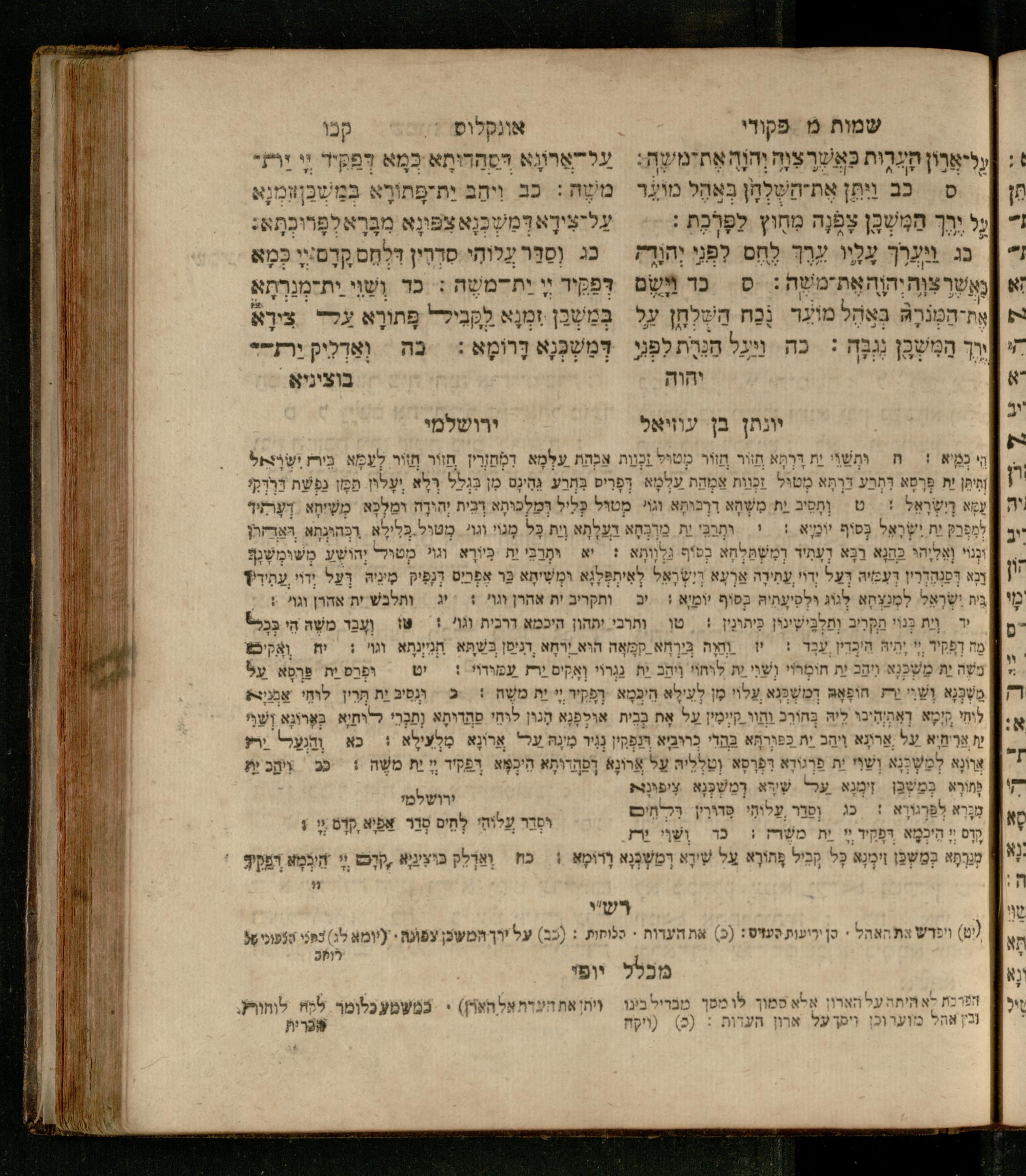 Sefer Shemot : ʿim 3 targumim ... pe. Rashi, u-ferush Rashbam u-ferush Mikhlal yofi min R. Shelomoh ben Melekh u-ferush Beʾer reḥovot ʿal diḳduḳe Rashi ... ṿe-Sefer ha-Ḥinukh me-Rabenu Aharon ha-Leṿi ... / huva le-vet ha-defus ʿa.y. ha-torani ha-mufla mo.h.r.R. Pinḥas Eliyahu ben ha-torani ha-manhig mo.h.r.R. Ḥayim Kats u-veno ha-torani ha-mufla mo.h.r.R. Shemuʾel Kats mi-ḳ.ḳ. Ṿilnaספר שמות : עם ג׳ תרגומים ... פירש״י, ופירוש רש״בם ופירוש מכלל יופי מן ר׳ שלמה בן מלך ופירוש באר רחובות על דקדוקי רש״י ... וספר החינוך מרבינו אהרן הלוי ... / הובא לבית הדפוס ע״י התורני המופלא מוה״רר פנחס אליהו בן התורני המנהיג מוה״רר חיים כ״ץ ובנו התורני המופלא מוה״רר שמואל כ״ץ מק״ק ווילנא