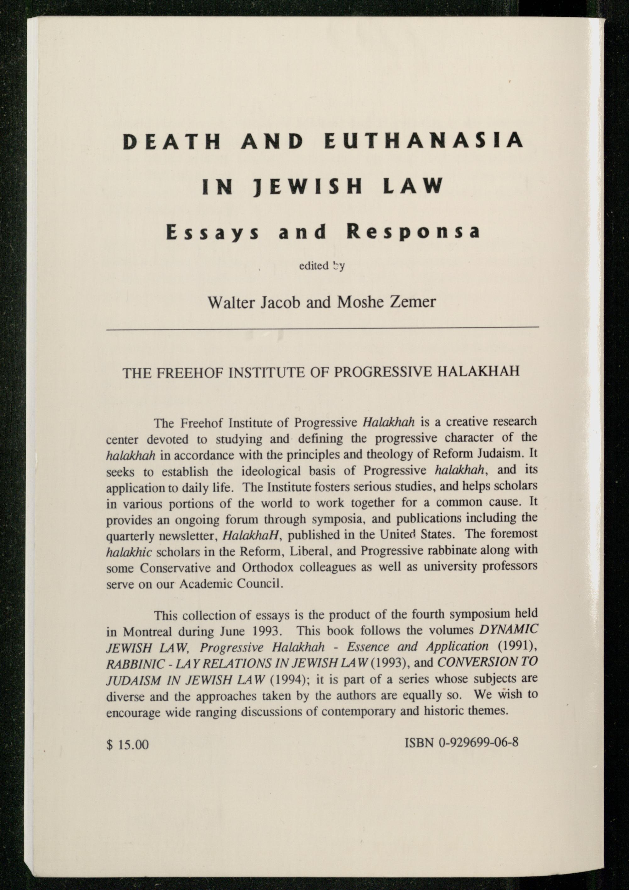 Death and euthanasia in Jewish law : essays and responsa / edited by Walter Jacob and Moshe Zemer