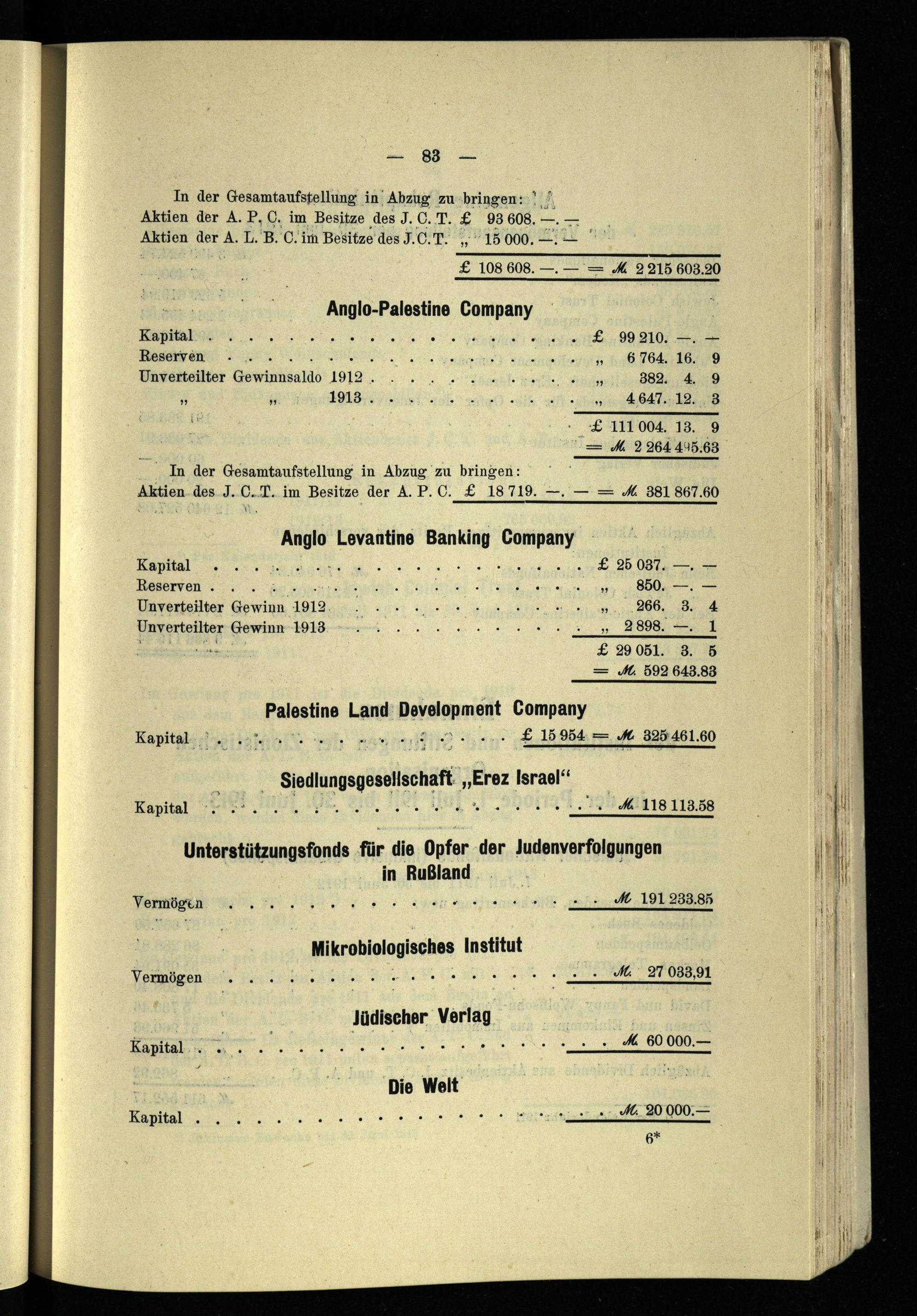 Vermögen der Institutionen und Stiftungen der Zionistischen Organisation per 30. Juni 1913.