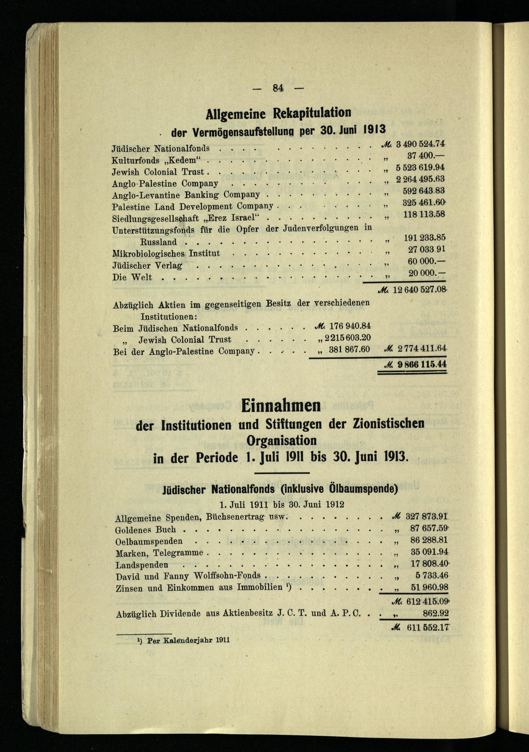 Vermögen der Institutionen und Stiftungen der Zionistischen Organisation per 30. Juni 1913.